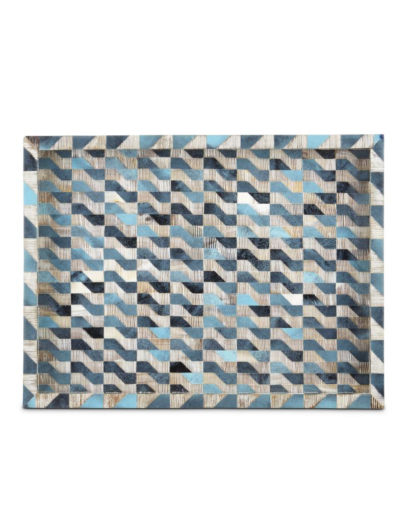 The Ezra Tray is a decorative tray made of alternating colors of bone and chiseled horn. The wavy pattern is created when blue, brown, and ivory colored bone and horn are hand-applied to the surface, which makes the blue and brown tray an artisanal accessory that packs a textural punch. Place this lovely decorative accessory on a kitchen island or a buffet and it will be a dynamic accent whether or not it holds any meal-specific elements.