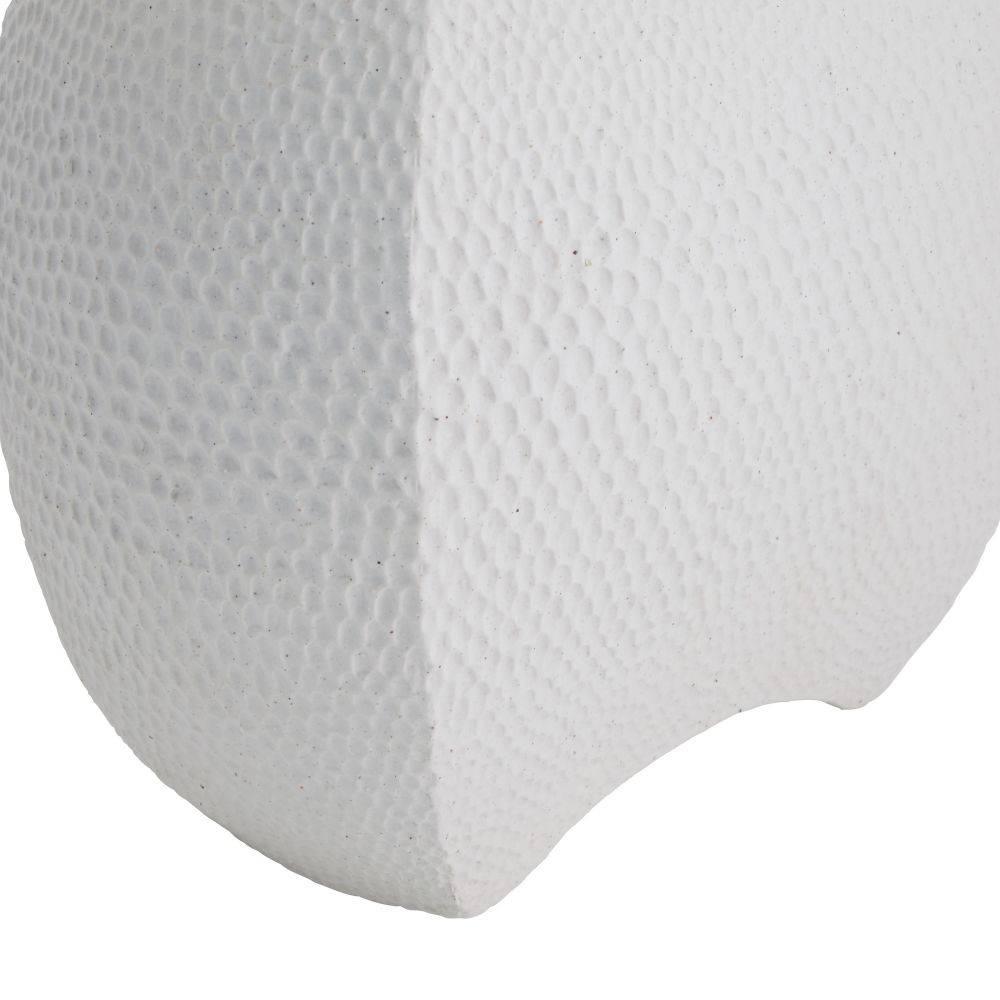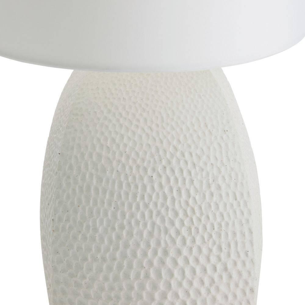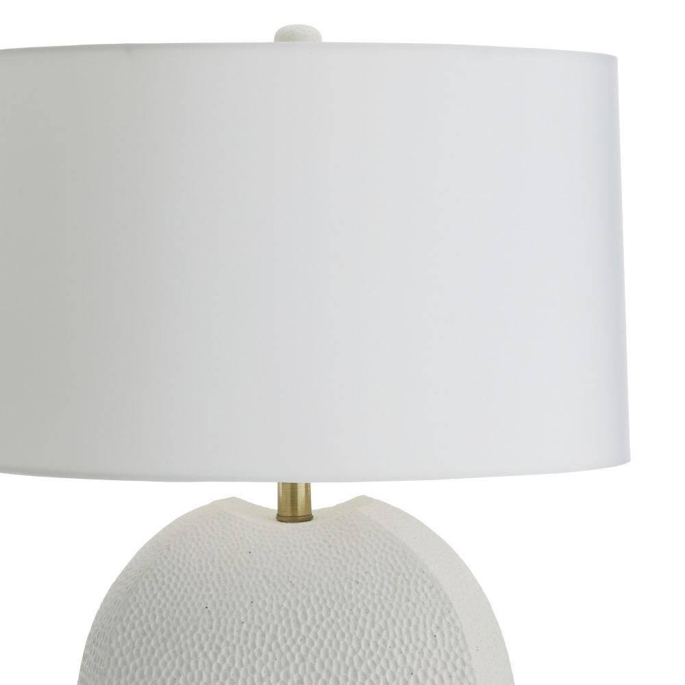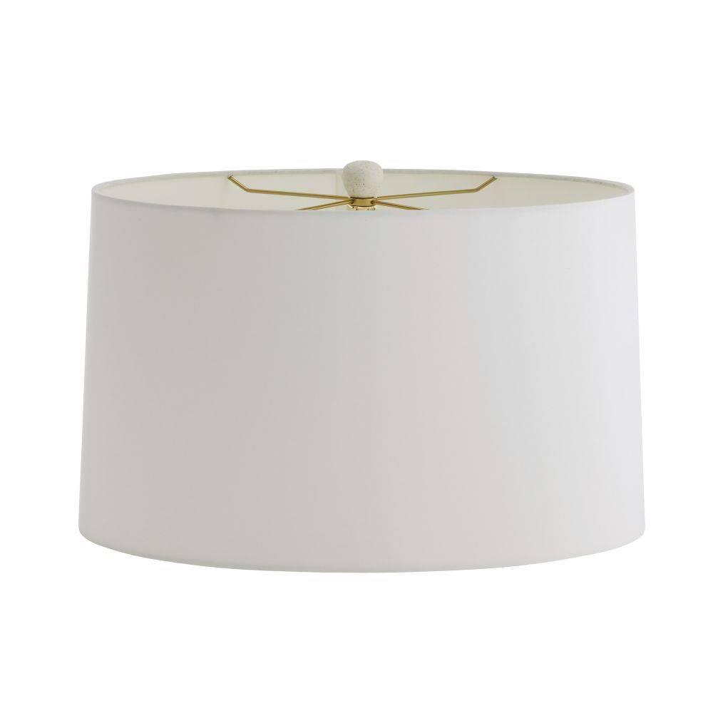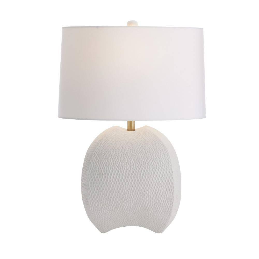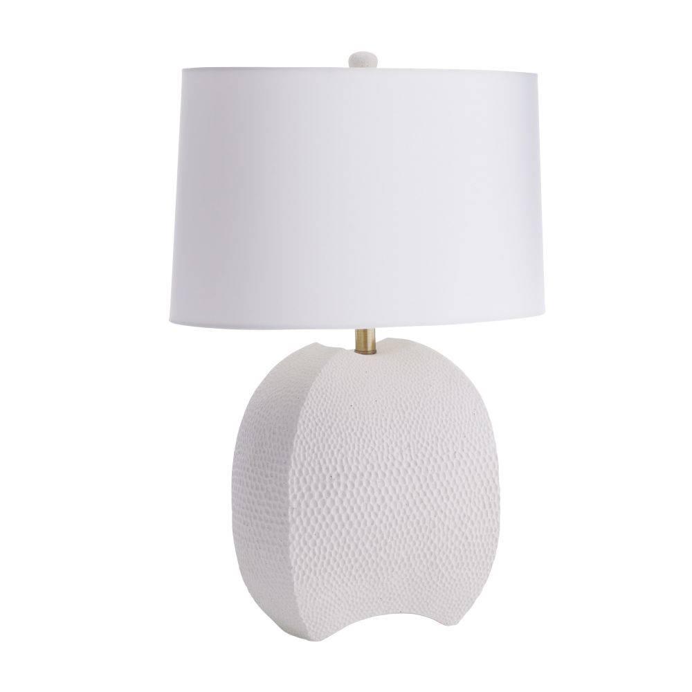 Our white ceramic lamp's soft organic form possesses the carved texture of a coral reef. Designed to draw the eye upward with its subtly curved shape, it is finished with rectangular feet for secure placement. A matching finial and oval shaped white microfiber shade lined in off-white cotton complements the neutral palette. Steel hardware plated in antique brass. Finish will vary.