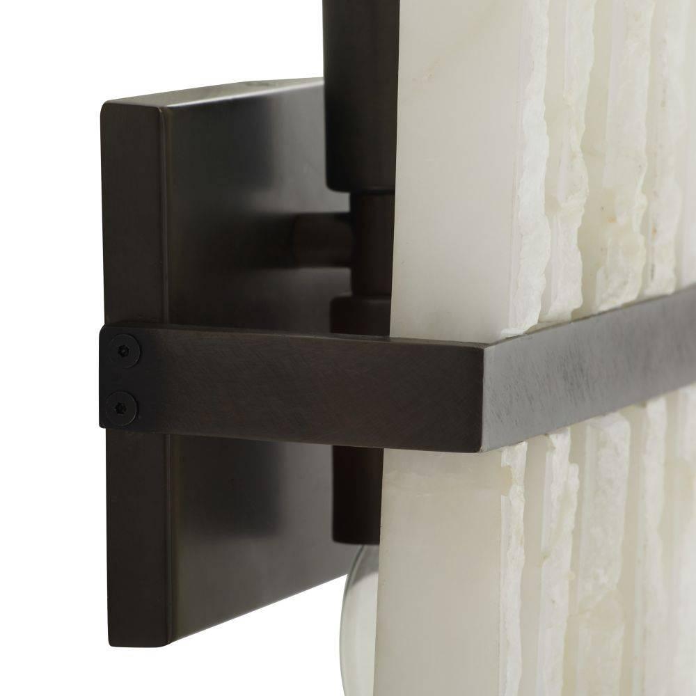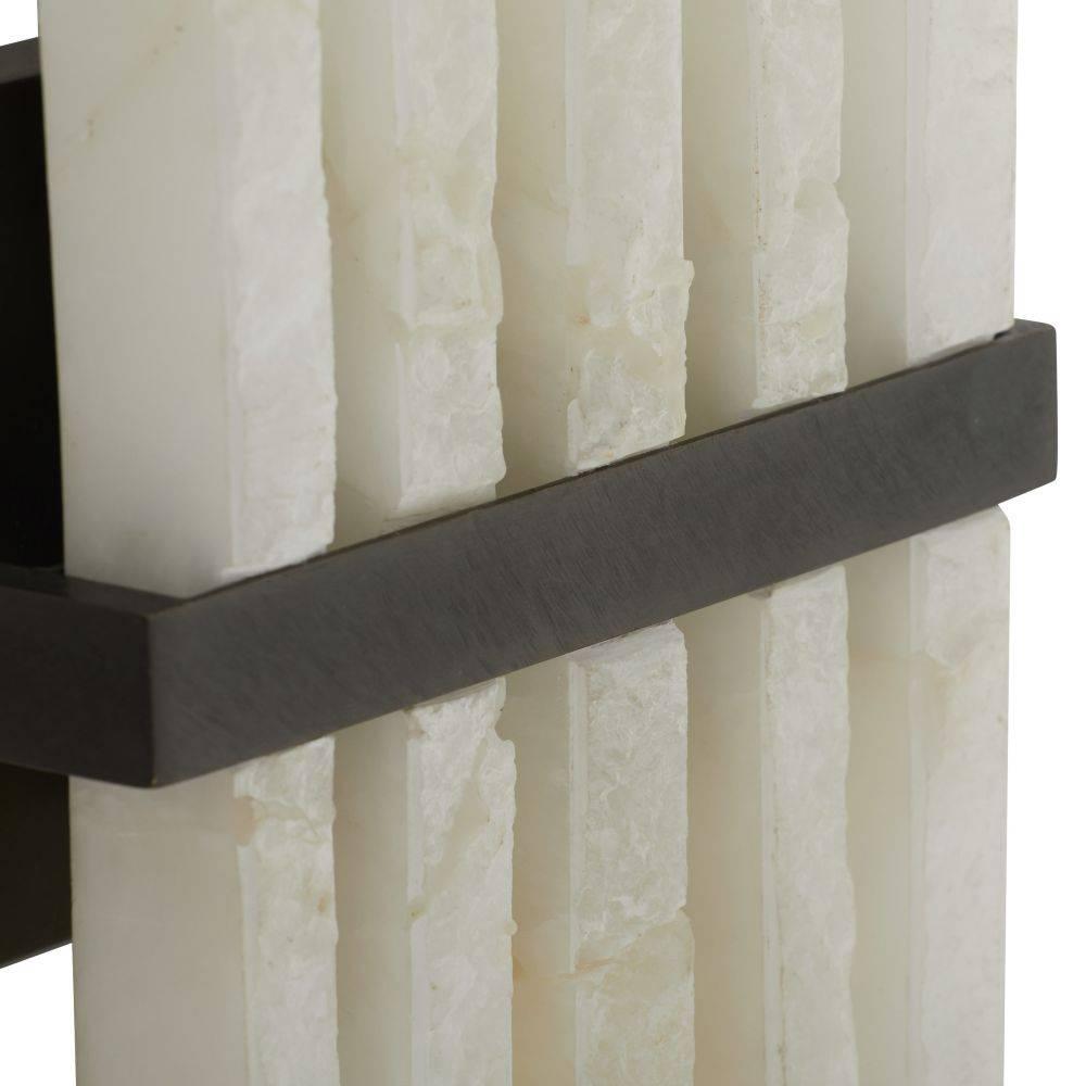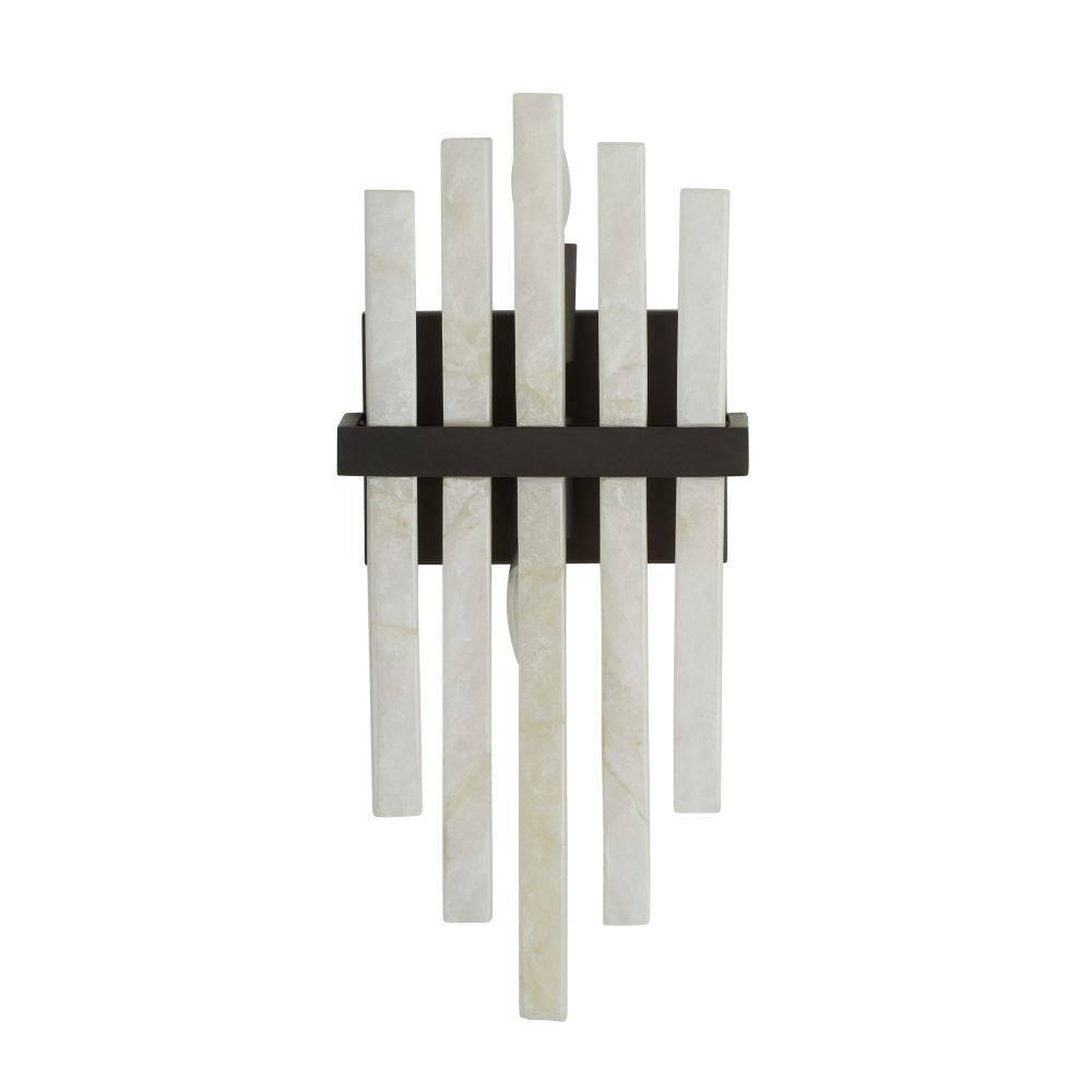 With a silhouette inspired by the ranks of a pipe organ, echoing forms of white chiseled alabaster are mounted on a rectangular backplate of English bronze-plated iron. The raw chiseled edges of each unique piece of stone highlight the character of Fairfax's materials. Damp-rated, although limited covered outdoor areas may affect finish. Finish will vary.