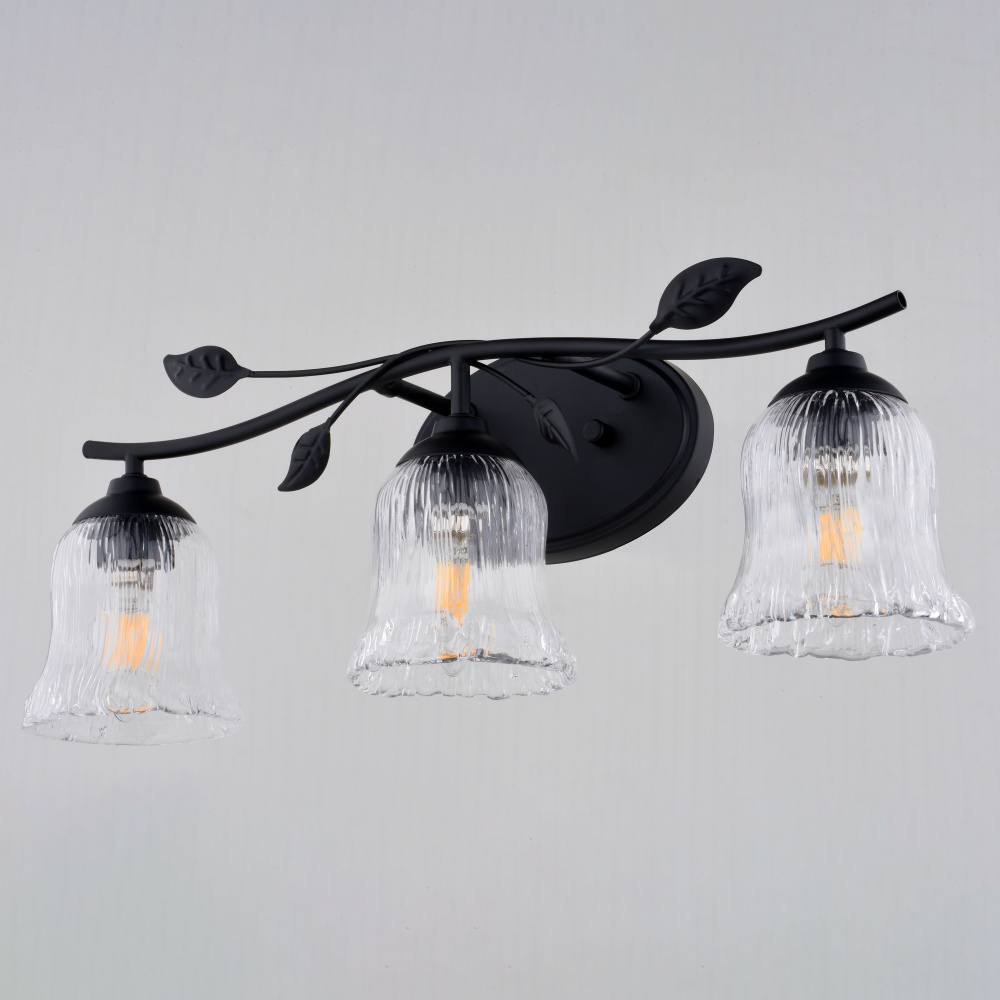 Bring the tranquility of nature to your bathroom with the Fairwood vanity wall light fixture. Key features include three lights for ample and balanced illumination and clear ribbed glass shades that add texture and beautifully diffuse the light while evoking natural forms. Each unique, branch-like shape is tipped with a delicate leaf that brings a touch of the outdoors in. The matte black finish complements the natural inspiration, adding a touch of modern sophistication. Transform your bathroom into a tranquil escape.