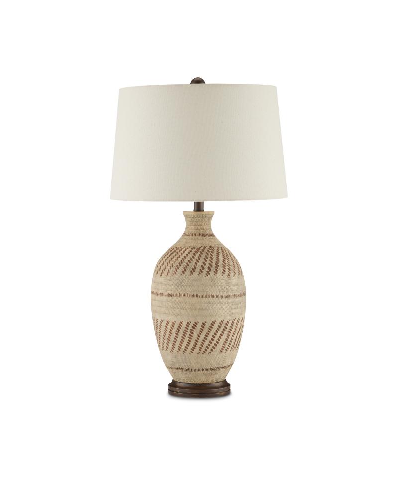 The earthen basket-weave texture of the Faiyum Table Lamp enlivens its classic pottery form to make it appear it is a wrapped confection of texture. The effect is created then the terracotta is glazed in tan and brown hues to hint at a woven pattern. The hand-rubbed bronze hardware and the flax linen shade blend perfectly with the tones in the lamp, which stands 31 inches tall.