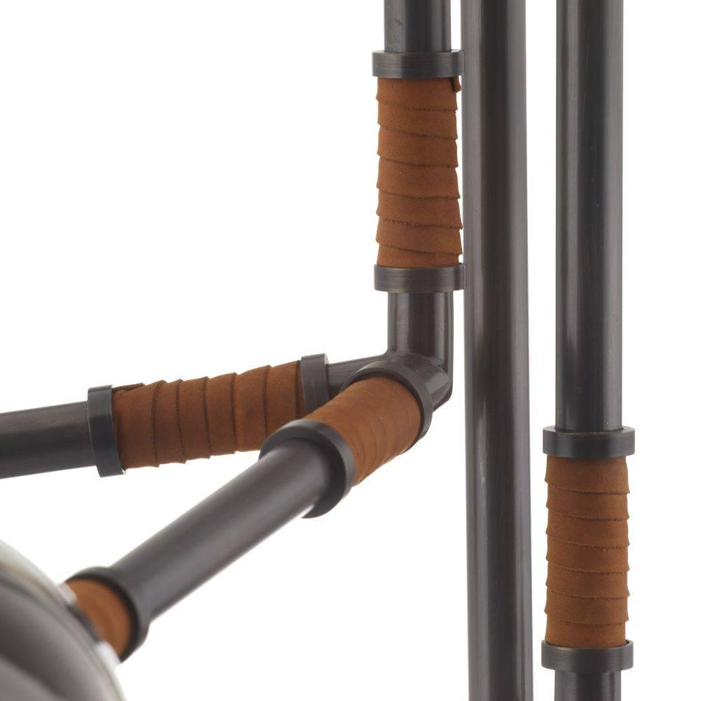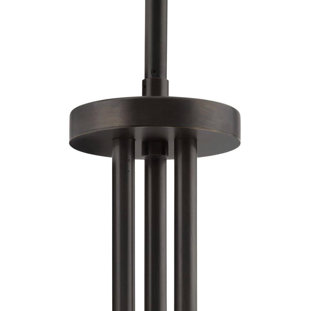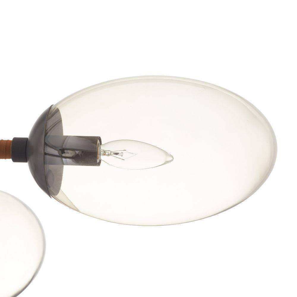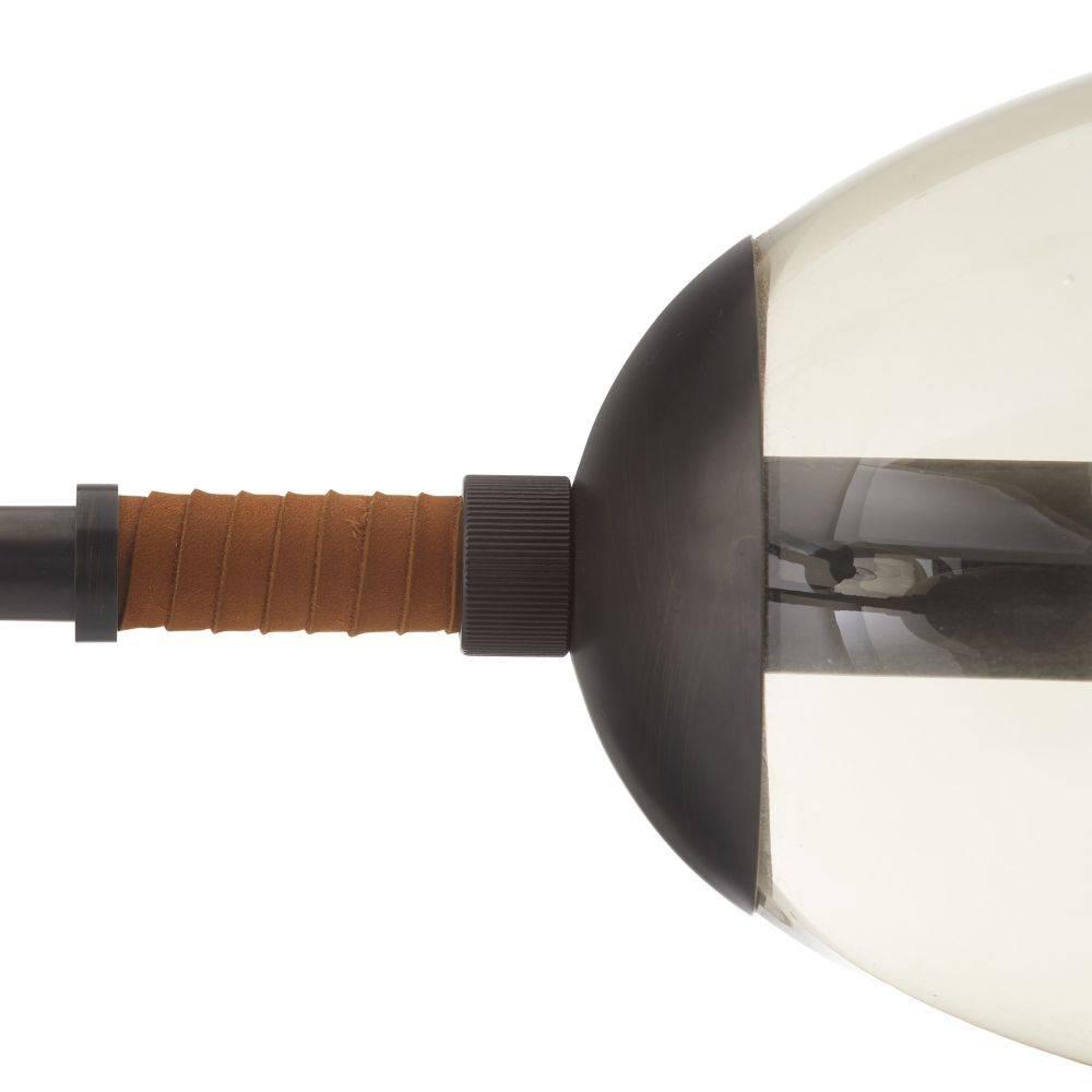 Our industrial-inspired style of English bronze-plated iron is accented with wrapped cognac leather for a tactile finish. Mounted on a slim iron pipe, each fixed branch is punctuated with a smoke glass globe, dispersing light in different directions to fully illuminate a space. Damp-rated, although limited covered outdoor areas may affect finish. Finish will vary.