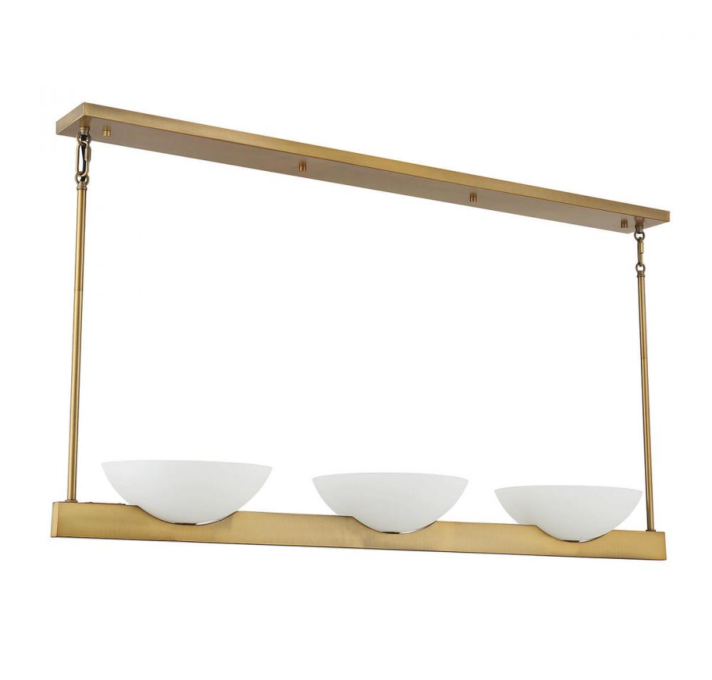 The Savoy House Fallon 3-light linear chandelier draws inspiration from Art Deco style, bringing you a look that is both timeless and classic. Generously sized shades of white opal glass and a warm brass finish ensure bright, beautiful illumination. Fallon is 45" in length, 10" in width and has an adjustable height ranging from 10.5" to 56.5". Uses three G9 bulbs, not included. Comes with eight 12" downrods and two 6" downrods, plus 80" of cord.