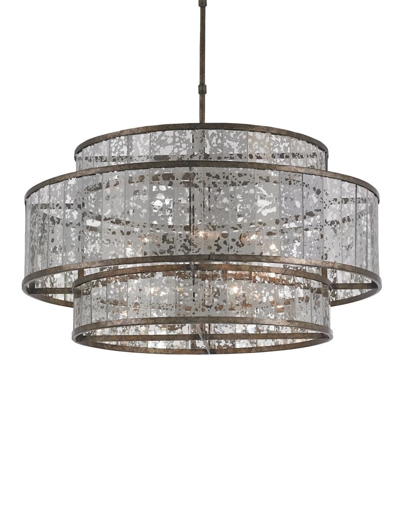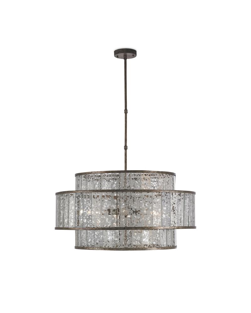 The Fantine Large Chandelier has shades made of Raj mirror that strikingly resemble mercury glass. The Pyrite bronze finish on the metal of this mirrored chandelier echoes the mottled tones in the glass to create synchronicity. The Fantine is also available in a small chandelier and a wall sconce. Adjustable from 25" to 54" with use of included chain/rod kit/cable. If your space calls for a longer drop, additional chain/rods/cable is available for purchase.