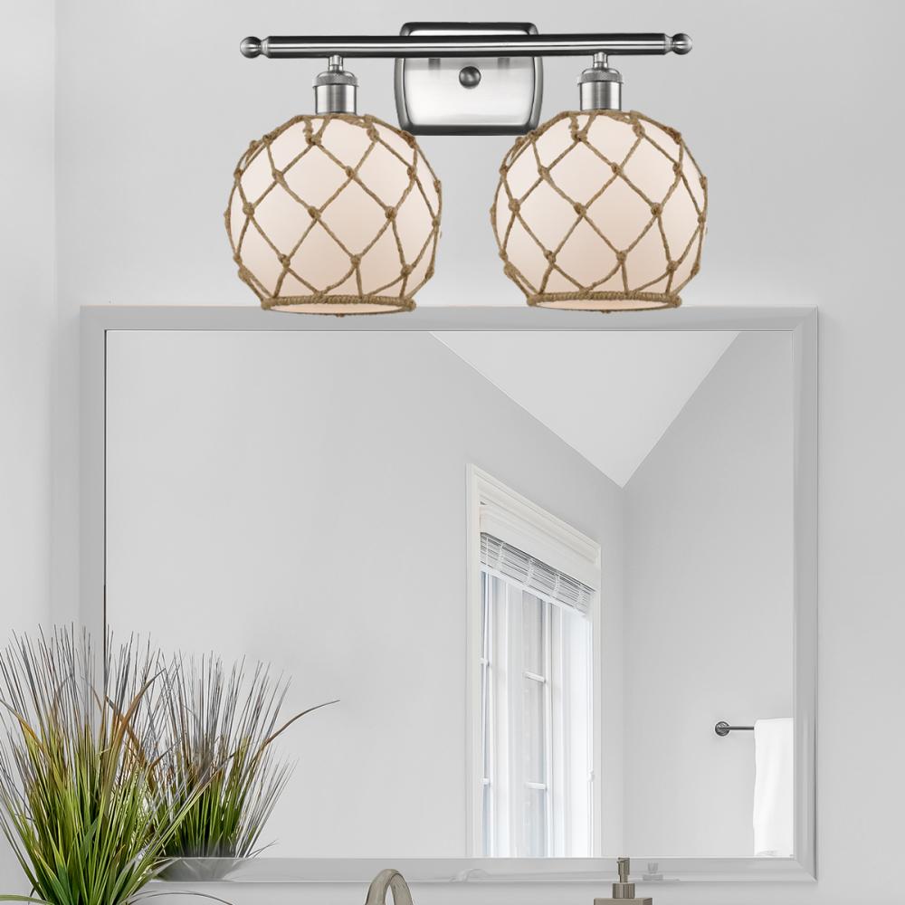 Farmhouse Rope - 2 Light - 18 inch - Brushed Satin Nickel - White Glass with Brown Rope Shade - Bath Vanity Light