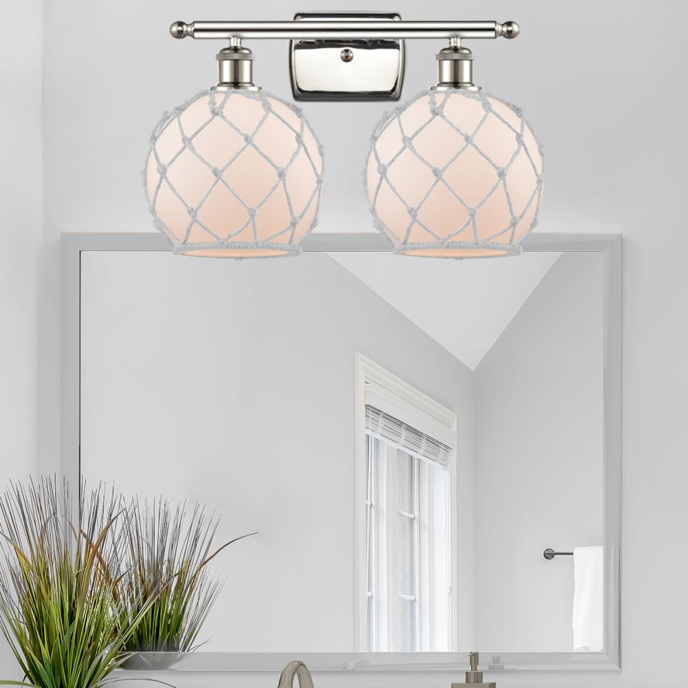 Farmhouse Rope - 2 Light - 18 inch - Polished Nickel - White Glass with White Rope Shade - Bath Vanity Light