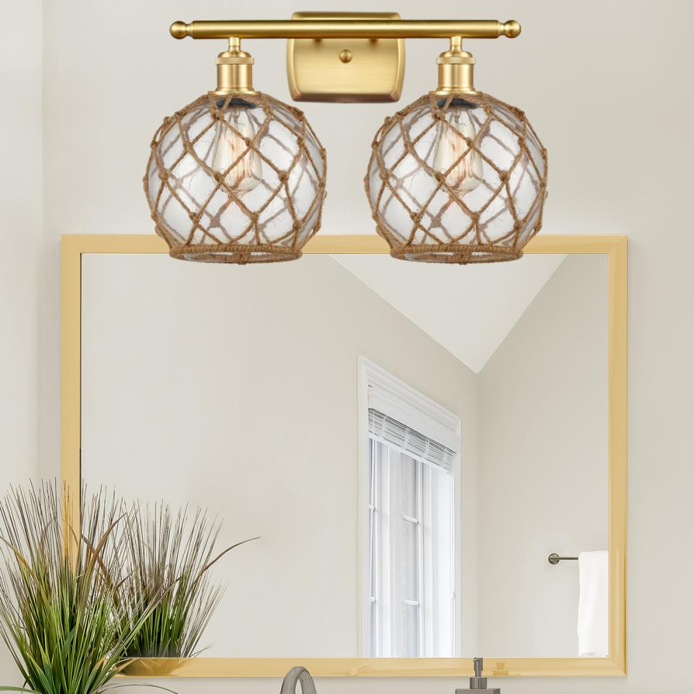 Farmhouse Rope - 2 Light - 18 inch - Satin Gold - Clear Glass with Brown Rope Shade - Bath Vanity Light
