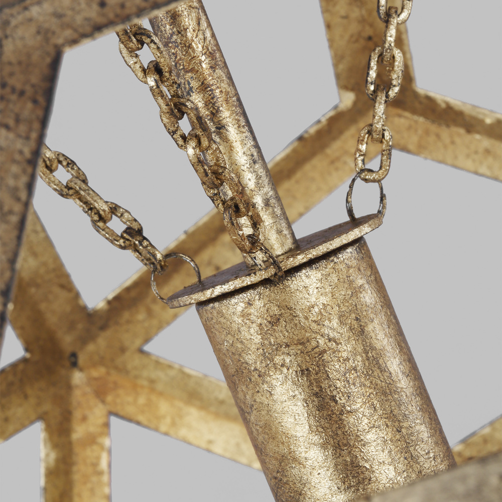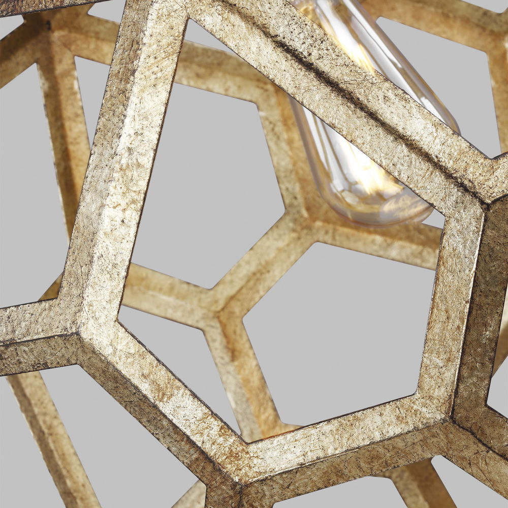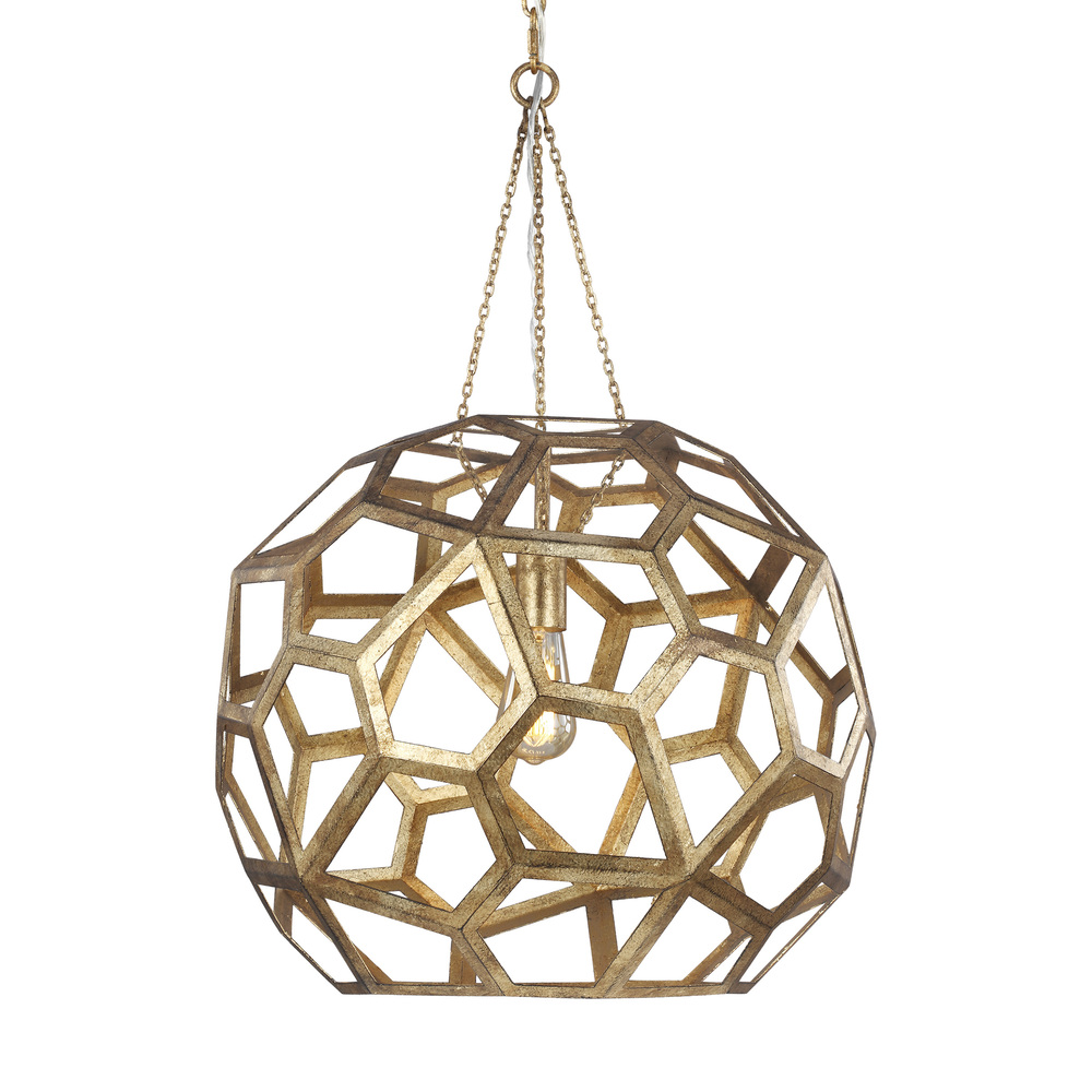 The Alexa Hampton Feccetta one light indoor pendant in antique gild is elegantly charming with a Mid-Century Modern appeal. The fixture is suspended by matching polished brass chain links, and both the shade and socket are held by three smaller chain links. The combination of its circular form with hexagonal shaped cut-out frame, illuminates light from any choice of lamping and can be elegantly placed as the focal point over an island or kitchen table. Alexa Hampton is an industry force who honors tradition and commits to the future, providing smart, stylish, design-rich solutions for every aspect of the home.