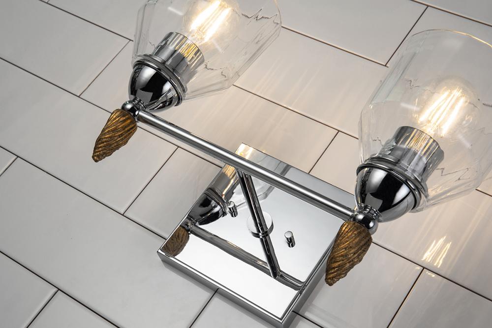 The Felice 2-Light Vanity Sconce blends classic and modern design with a polished chrome finish, gold finial, and dome-shaped glass shade. Perfect for bathrooms or artwork, its timeless style adds elegance to any space. Damp-rated and easy to install.