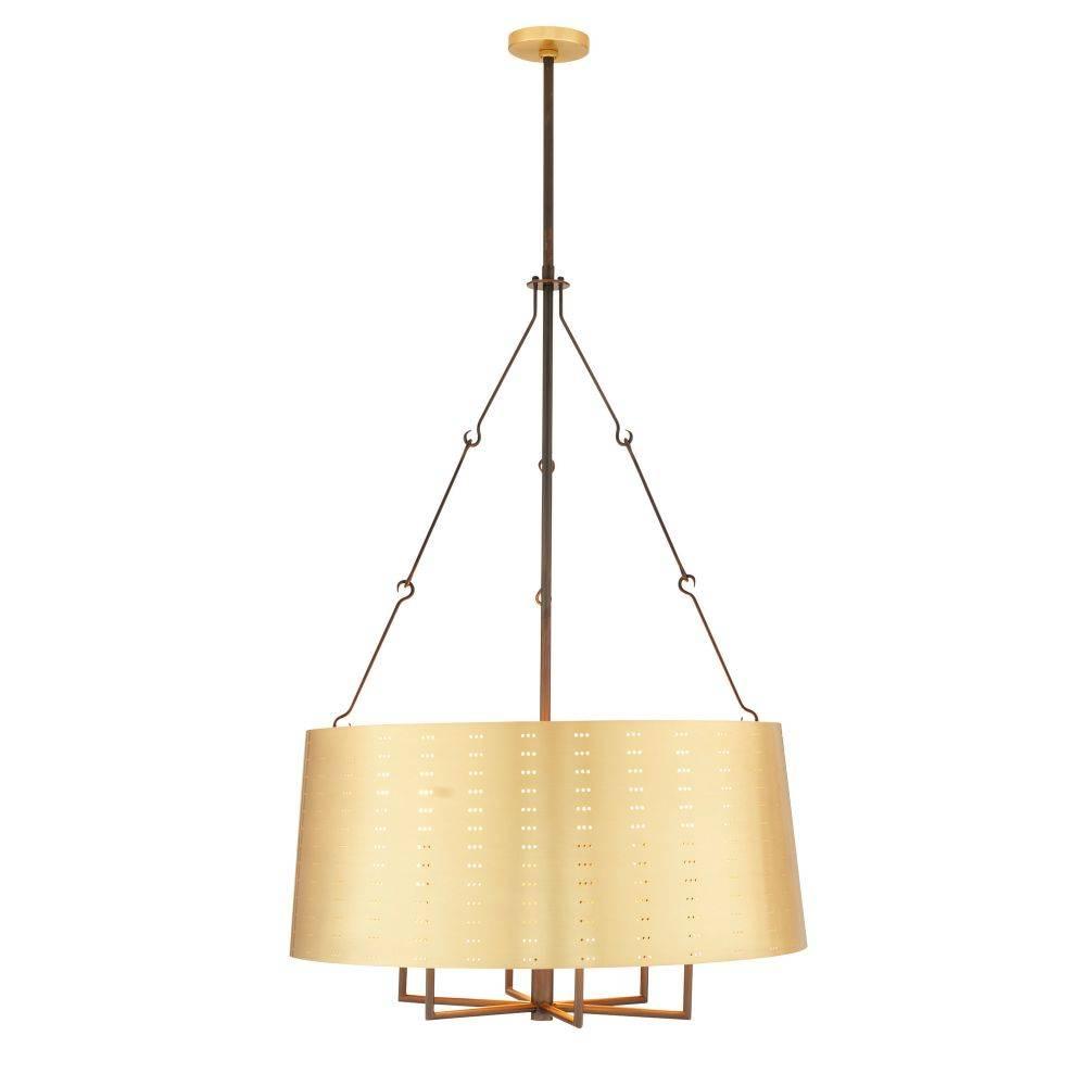 We perforated the Felipe to cast subtle shadows for a lace effect. Architecturally inspired, it juxtaposes an antique brass-plated iron shade with English bronze-plated iron arms and pipe. Damp-rated, although limited covered outdoor areas may affect finish.