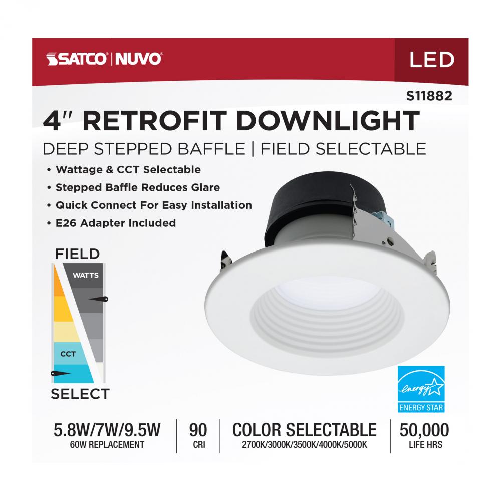 SATCO NUVO's S11882 4-inch round field selectable deep baffle retrofit downlight is designed with the look of sophistication in mind. The deep stepped baffle crafted on this downlight drastically reduces glare and with a high CRI rating of 90, users ca