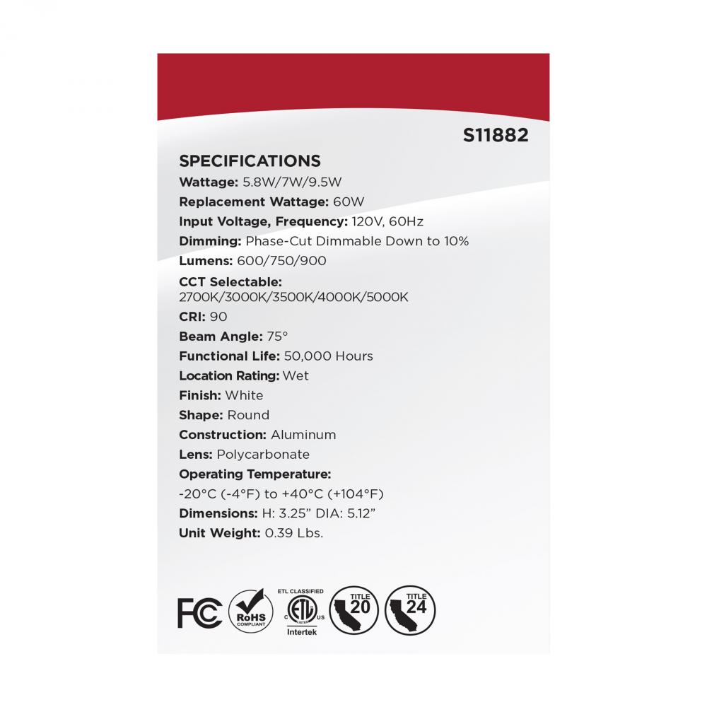Field Selectable LED Downlight Retrofit; Deep Baffle; 5.8/7/9.5 Watts; 27K/30K/35K/40K/50K CCT; 4
