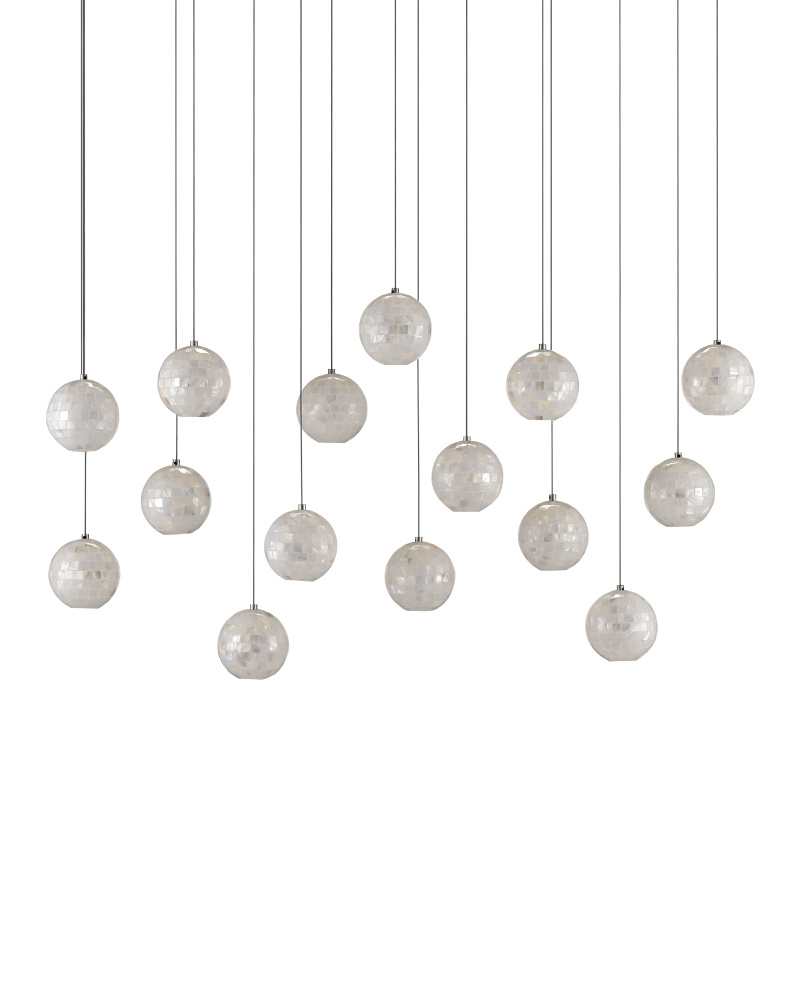 The Finhorn Rectangular 15-Light Multi-Drop Pendant has orb-shaped shades covered with small squares of mother of pearl, painstakingly hand-applied. The canopy of this piece is luminous in a painted silver finish. This fixture is among Currey & Company's multi-drop pendant collection, which includes multiple configurations.