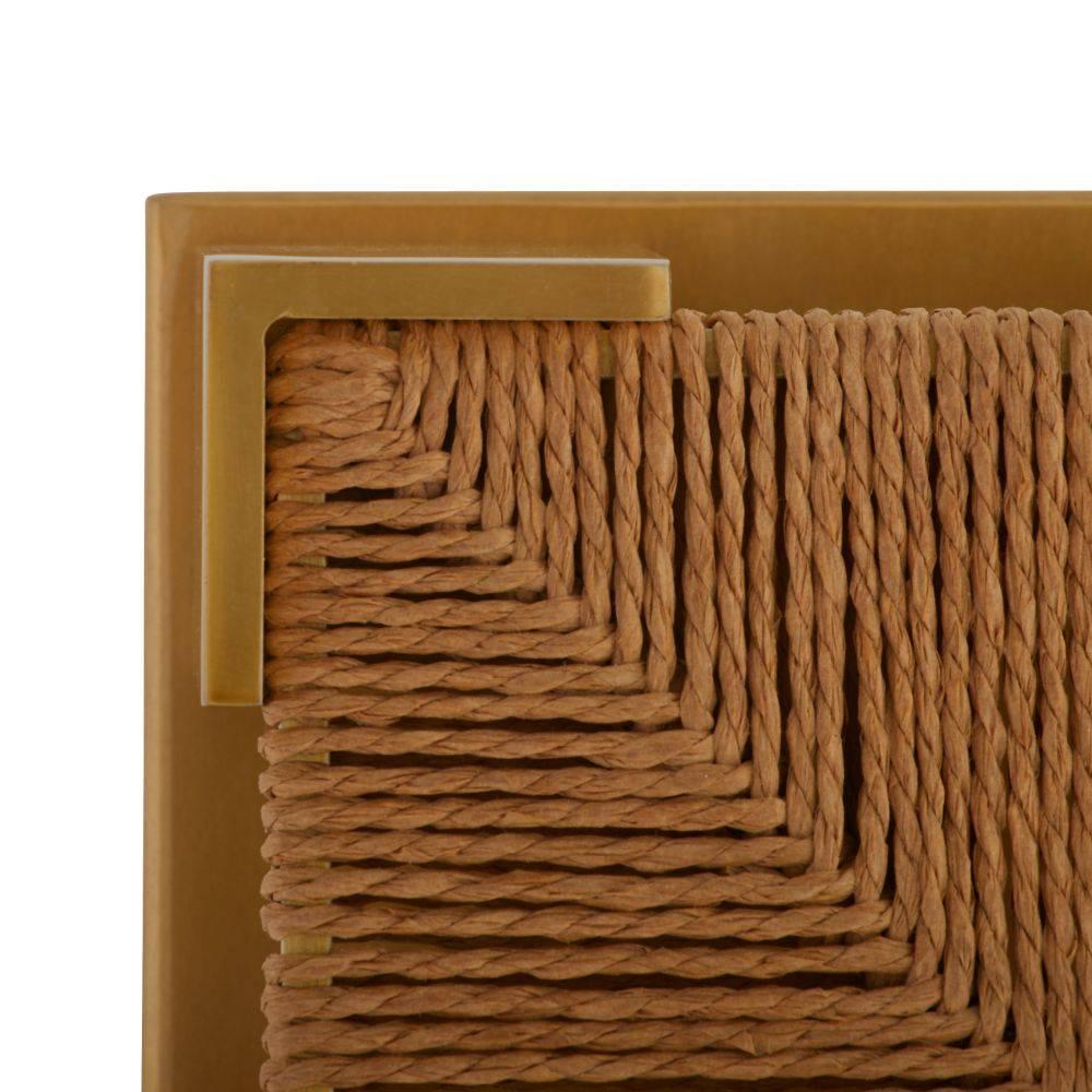 Woven in a traditional Scandinavian rush seat pattern, this natural jute rope fixture lends a natural materiality to an architectural form. Clamped in an antique brass-plated iron setting, it is a dynamic addition to a classic coastal or rustic lodge-style interior. Damp-rated, although limited covered outdoor areas may affect finish. Finish will vary.