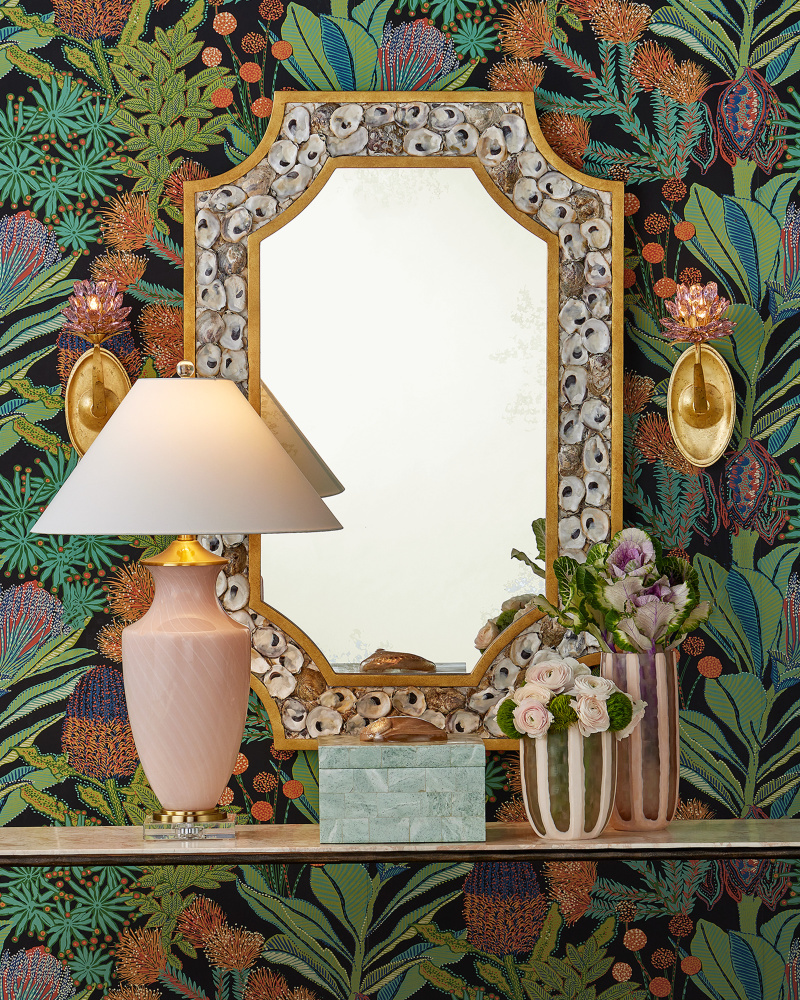 The Fiona Box is an artisanal piece created when serpentine stone is cut into pieces and placed on the exterior surfaces in a mosaic pattern. The interior of the mint-colored wood box is painted in a complementary green to enhanced the luxe feel of the decorative accessory. The beautiful pastel-colored box is topped with an abalone shell that is a gleaming decorative touch, though not a handle. The surfaces and the shell will vary slightly from piece to piece.