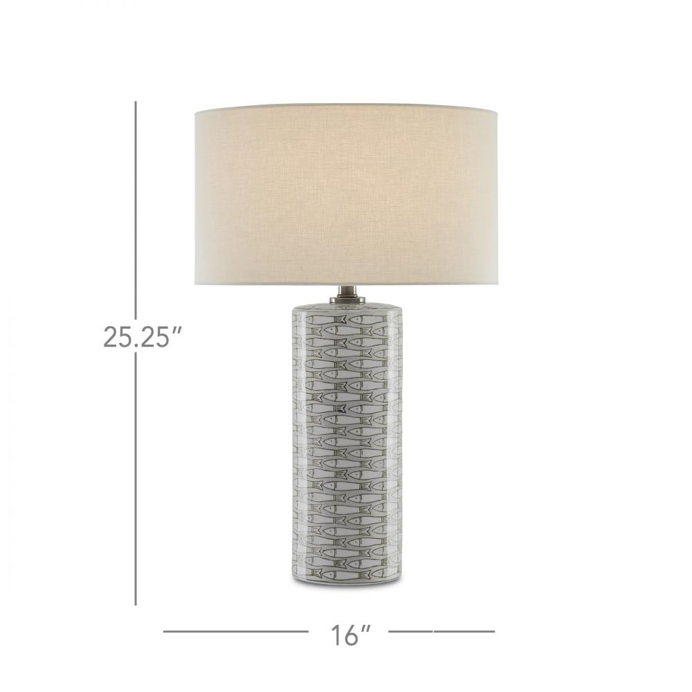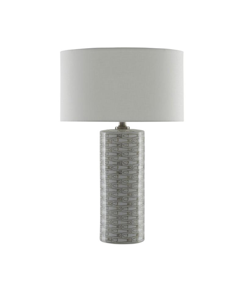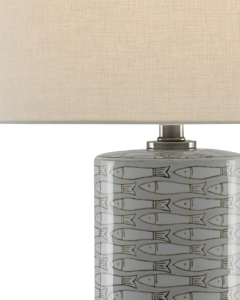 The Fisch Large Table Lamp has a fish pattern on the clean-lined porcelain column in gray and white. The antique nickel finish on the hardware echoes the tones in the glazing. We've topped the gray lamp with an off-white linen shade.