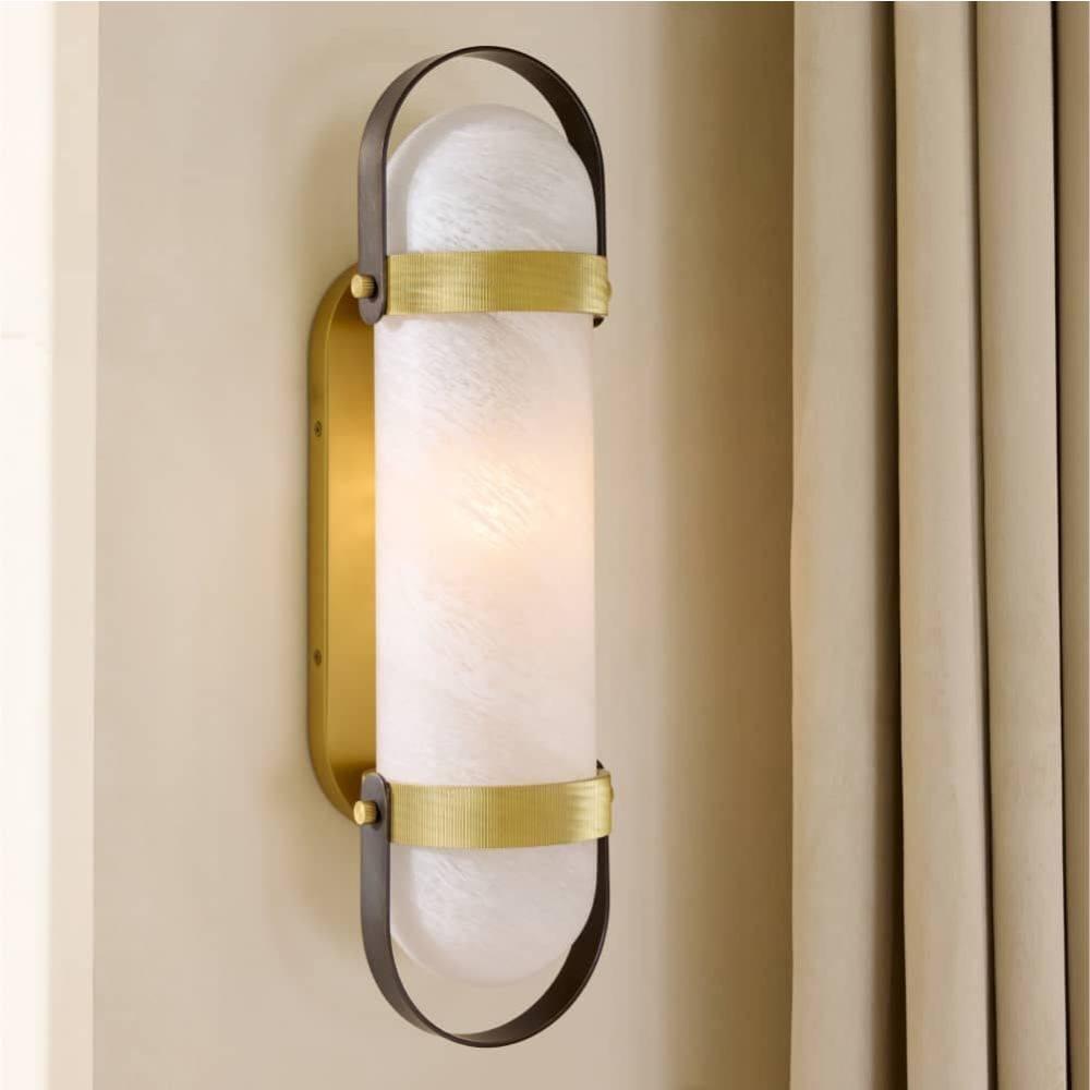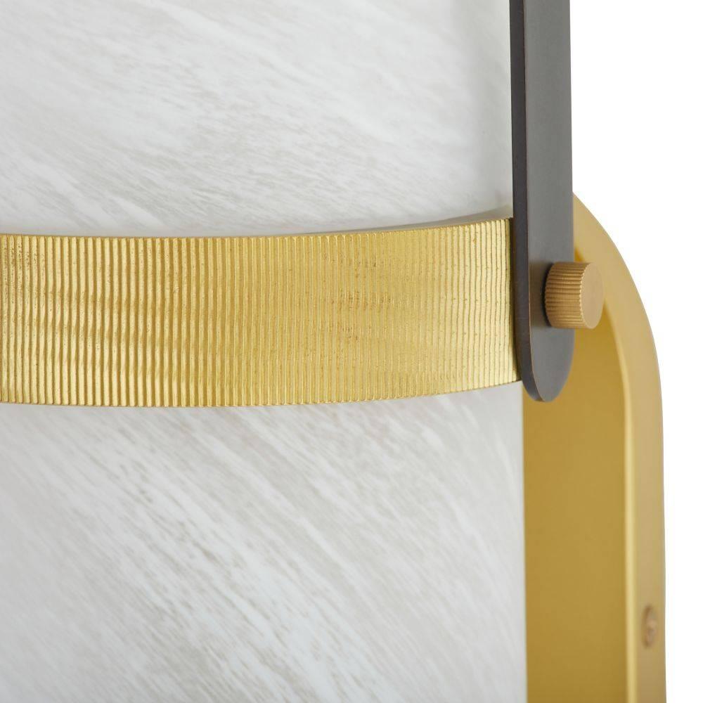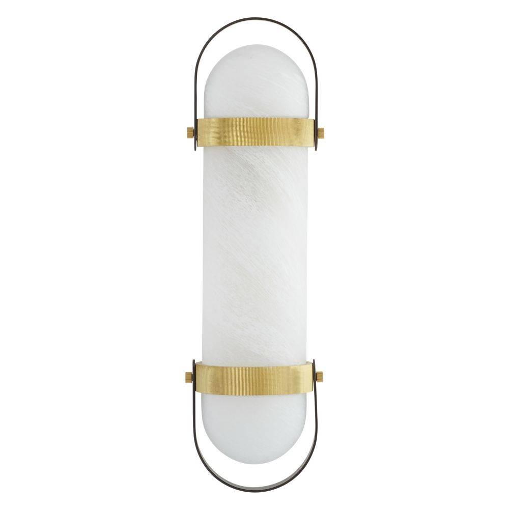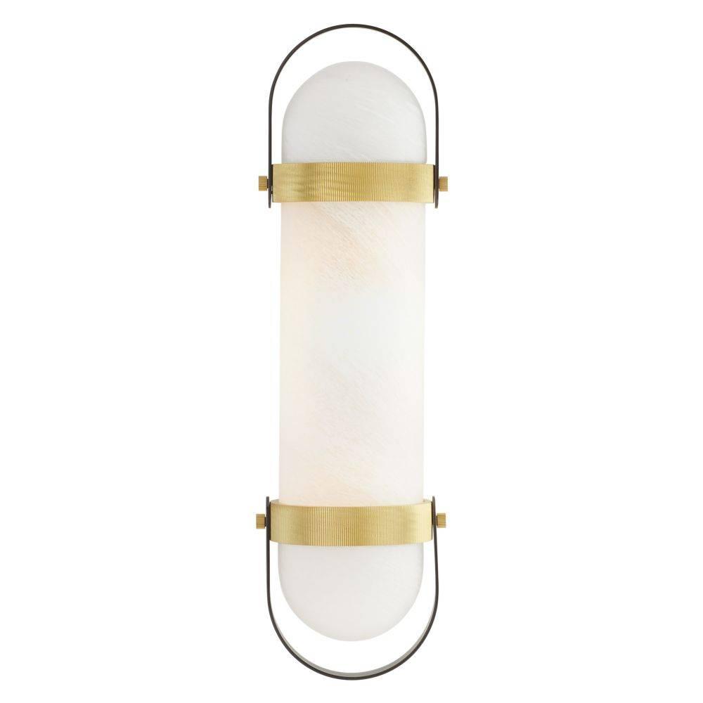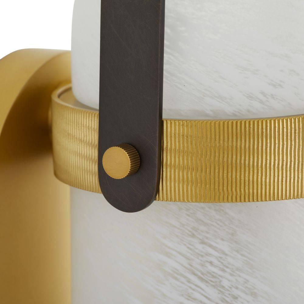 Equestrian-inspired stirrups of English bronze-plated steel highlight the pendant setting of this elegant sconce. A capsule-shaped fixture of matte swirl glass is mounted on a backplate of antique brass-plated steel, with ridged details adding textural interest. Damp-rated, although limited covered outdoor areas may affect finish. Finish will vary.