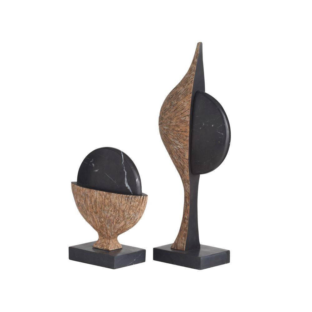 Black marble discs peek out from textural "pods" of ash-brown resin to resemble peas emerging from their shells. Each modernist inspired sculpture is anchored by a sturdy base of black marble. Finish will vary.