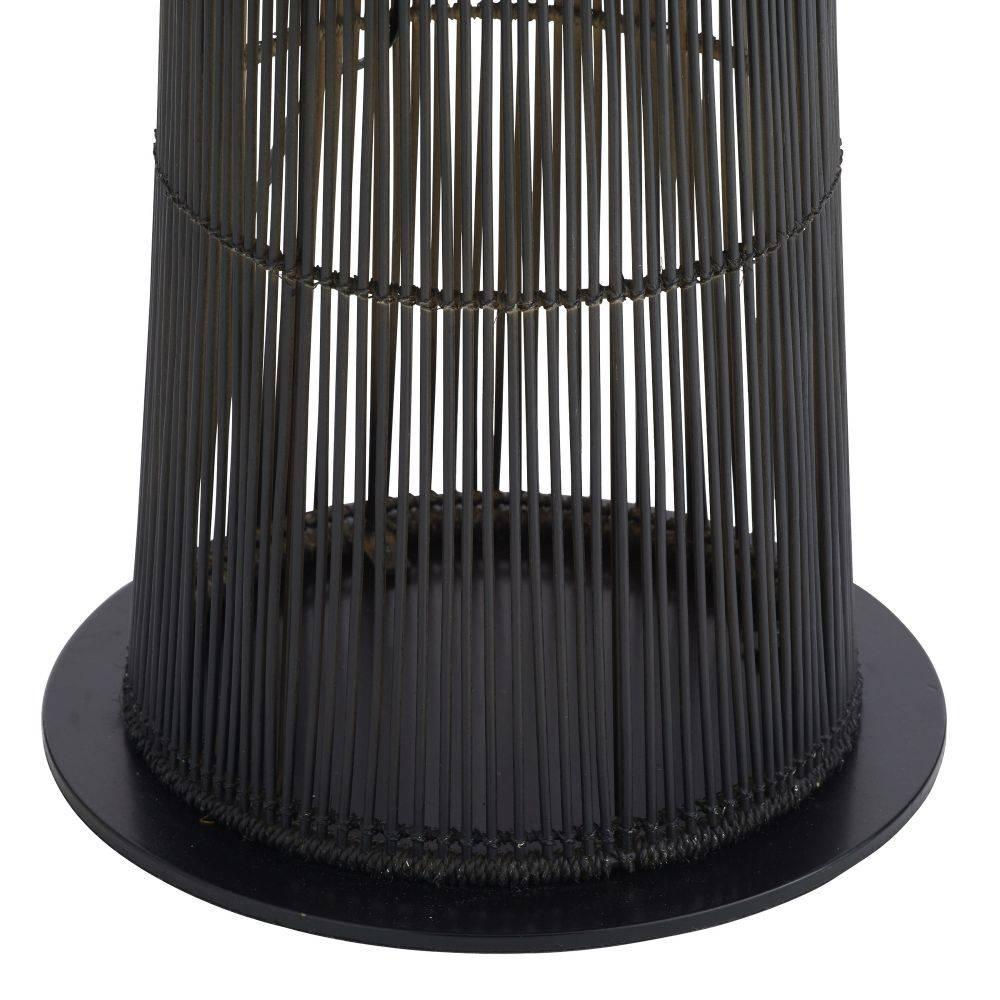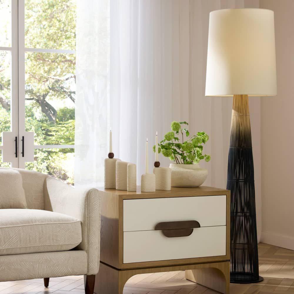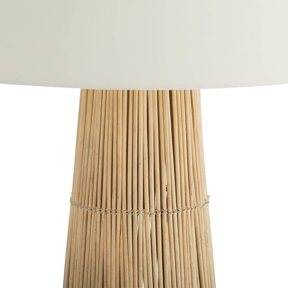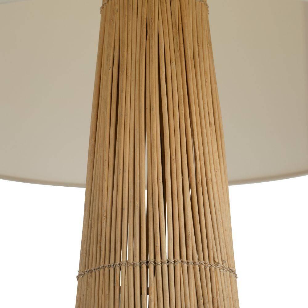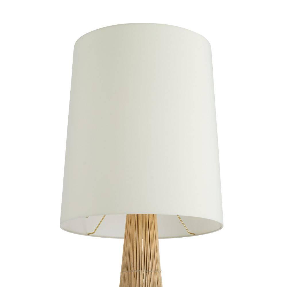 Utilizing Old World techniques, we created a luxurious yet modern fixture from thin midrib buri sticks derived from Asian tropical palms. Reminiscent of traditional methods used in fishing baskets, the ombre finish ranges in hue from natural to deepest black, lending contemporary flair. Accented with antique brass-plated steel hardware, a bronze-plated steel base, and an oversized drum shade of putty microfiber. Finish will vary.