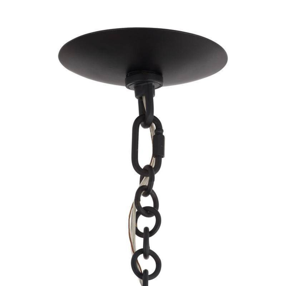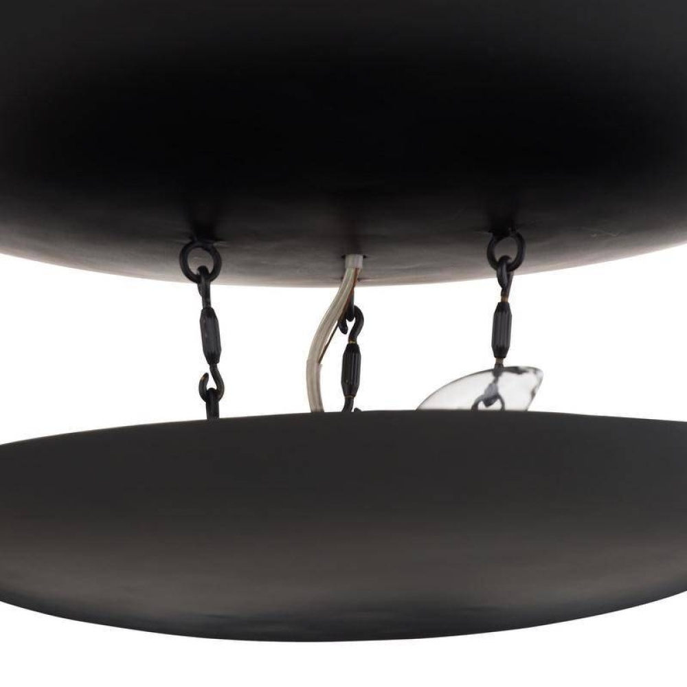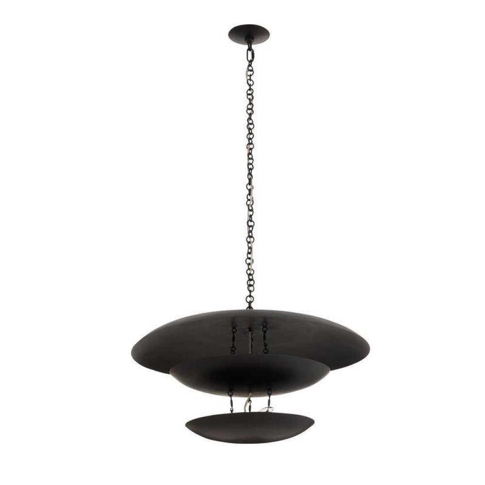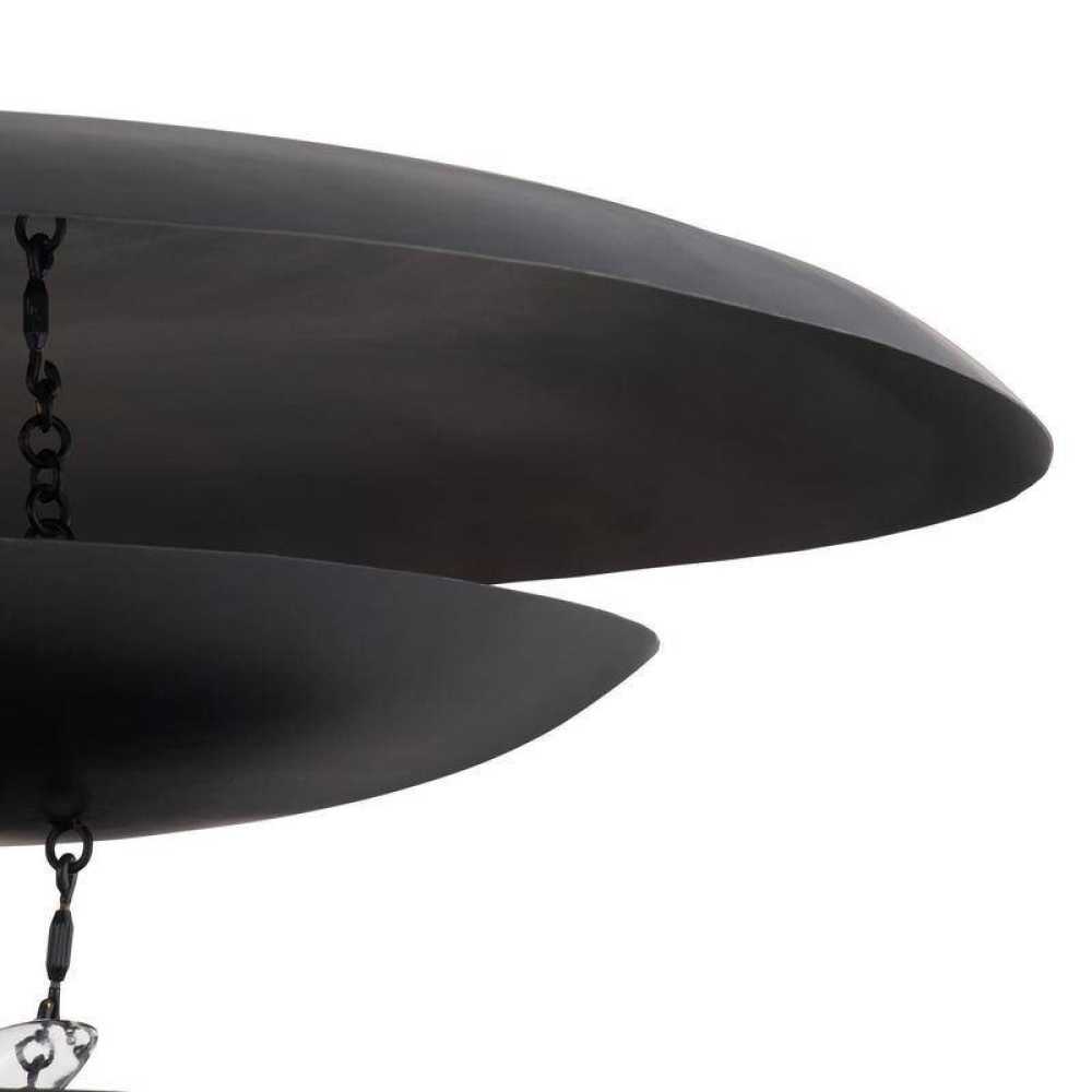 An extension of the classic Florko chandelier, our refreshed style of blackened iron is out-of-this-world. This eight-light design features iron curved discs that float effortlessly under the space-like dome. Both lower levels hold lights, creating a soft glow. Damp-rated, although limited covered outdoor conditions may affect finish.