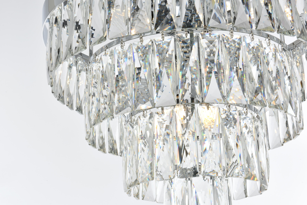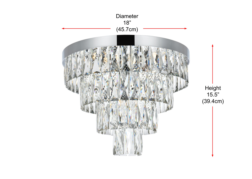 Transform your space with this extraordinary flush mount that reimagines classical crystal design for contemporary interiors. The masterfully engineered silhouette features four graduating tiers that create a spectacular inverted pyramid, reminiscent of a frozen cascade captured in mid-descent. Each precisely cut rectangular crystal is strategically positioned to maximize light play, creating mesmerizing displays of fractured light throughout your space. The substantial scale makes this fixture an ideal centerpiece for bedrooms, closets, hallways, sophisticated dining rooms, or executive offices. The thoughtful construction incorporates six light sources distributed throughout the tiers, ensuring both spectacular illumination and enchanting crystal animation. The robust iron framework provides a secure foundation while maintaining visual lightness, allowing the crystals to appear as if floating in space. Available in reflective chrome, sophisticated black, or warm satin gold, this flush mount makes an unforgettable statement while maintaining refined restraint. The cascading arrangement creates a sense of movement and flow, while the geometric precision of each crystal adds contemporary edge to the classical form. This is more than a light fixture – it's an architectural feature that transforms your space through its commanding presence and spectacular light performanc