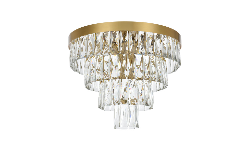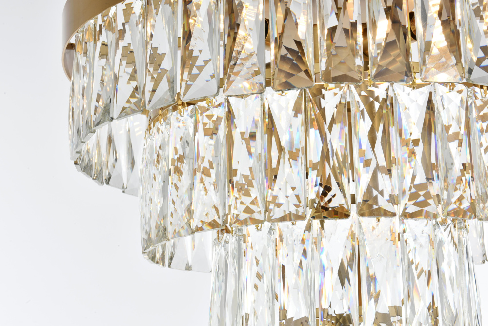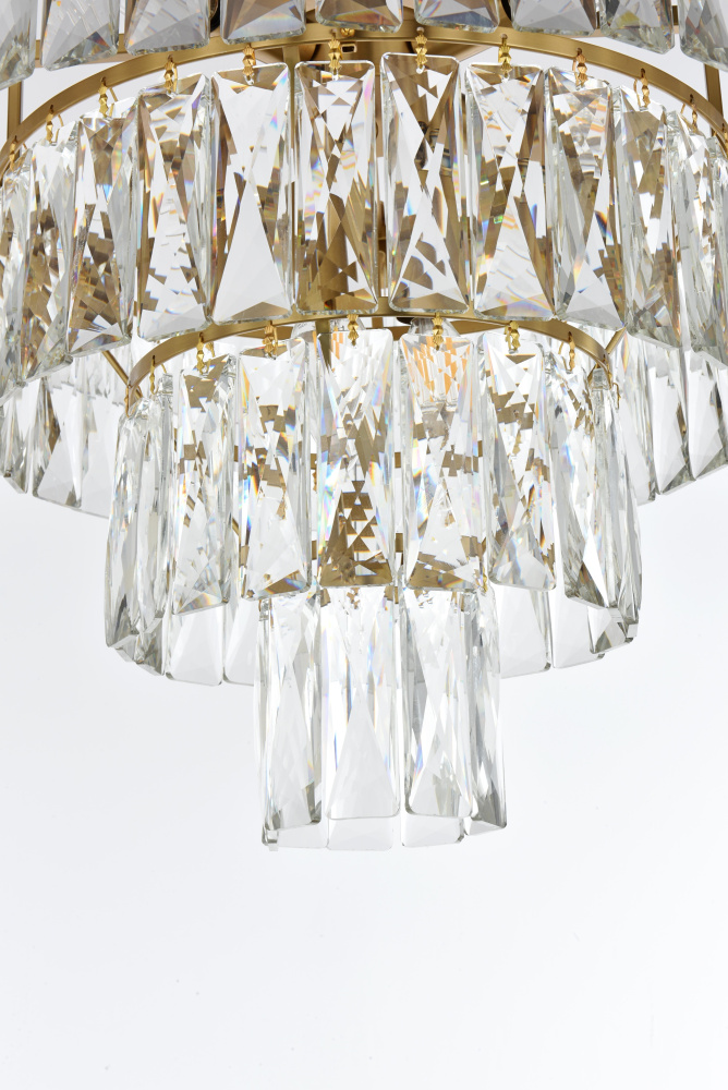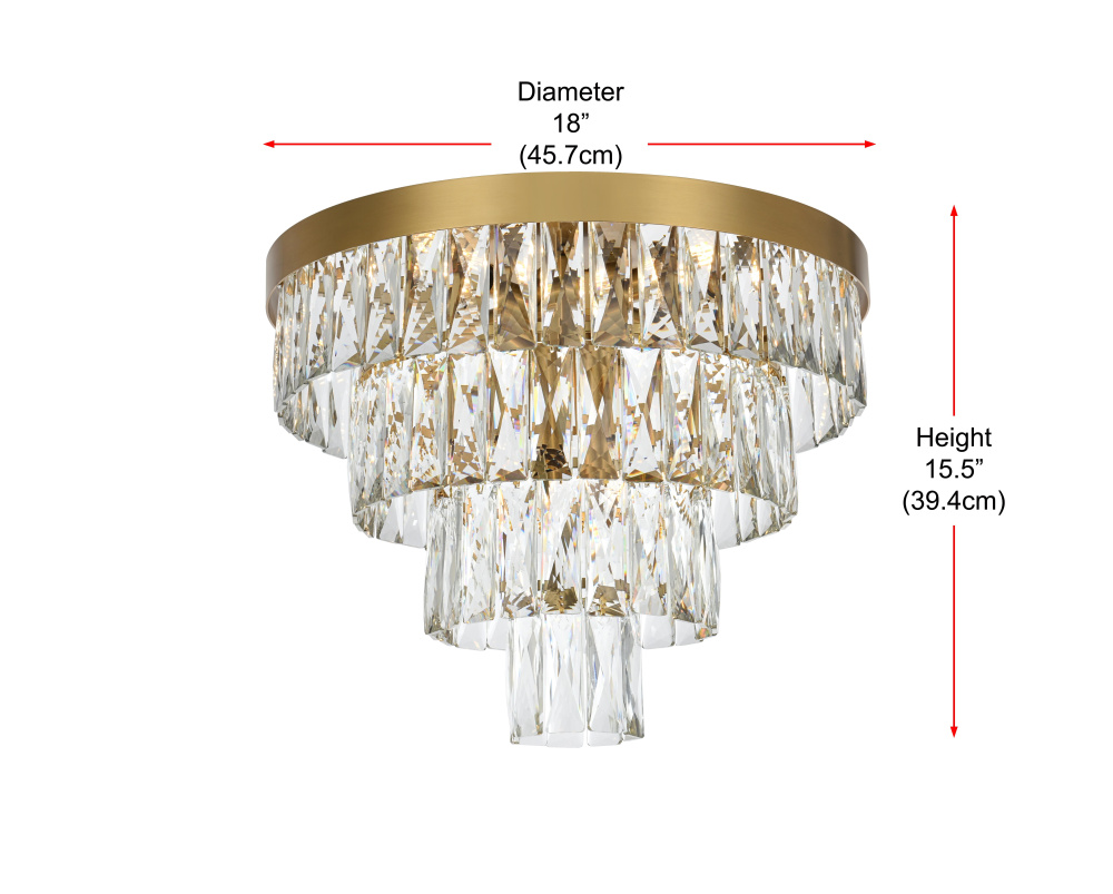 Transform your space with this extraordinary flush mount that reimagines classical crystal design for contemporary interiors. The masterfully engineered silhouette features four graduating tiers that create a spectacular inverted pyramid, reminiscent of a frozen cascade captured in mid-descent. Each precisely cut rectangular crystal is strategically positioned to maximize light play, creating mesmerizing displays of fractured light throughout your space. The substantial scale makes this fixture an ideal centerpiece for bedrooms, closets, hallways, sophisticated dining rooms, or executive offices. The thoughtful construction incorporates six light sources distributed throughout the tiers, ensuring both spectacular illumination and enchanting crystal animation. The robust iron framework provides a secure foundation while maintaining visual lightness, allowing the crystals to appear as if floating in space. Available in reflective chrome, sophisticated black, or warm satin gold, this flush mount makes an unforgettable statement while maintaining refined restraint. The cascading arrangement creates a sense of movement and flow, while the geometric precision of each crystal adds contemporary edge to the classical form. This is more than a light fixture – it's an architectural feature that transforms your space through its commanding presence and spectacular light performanc