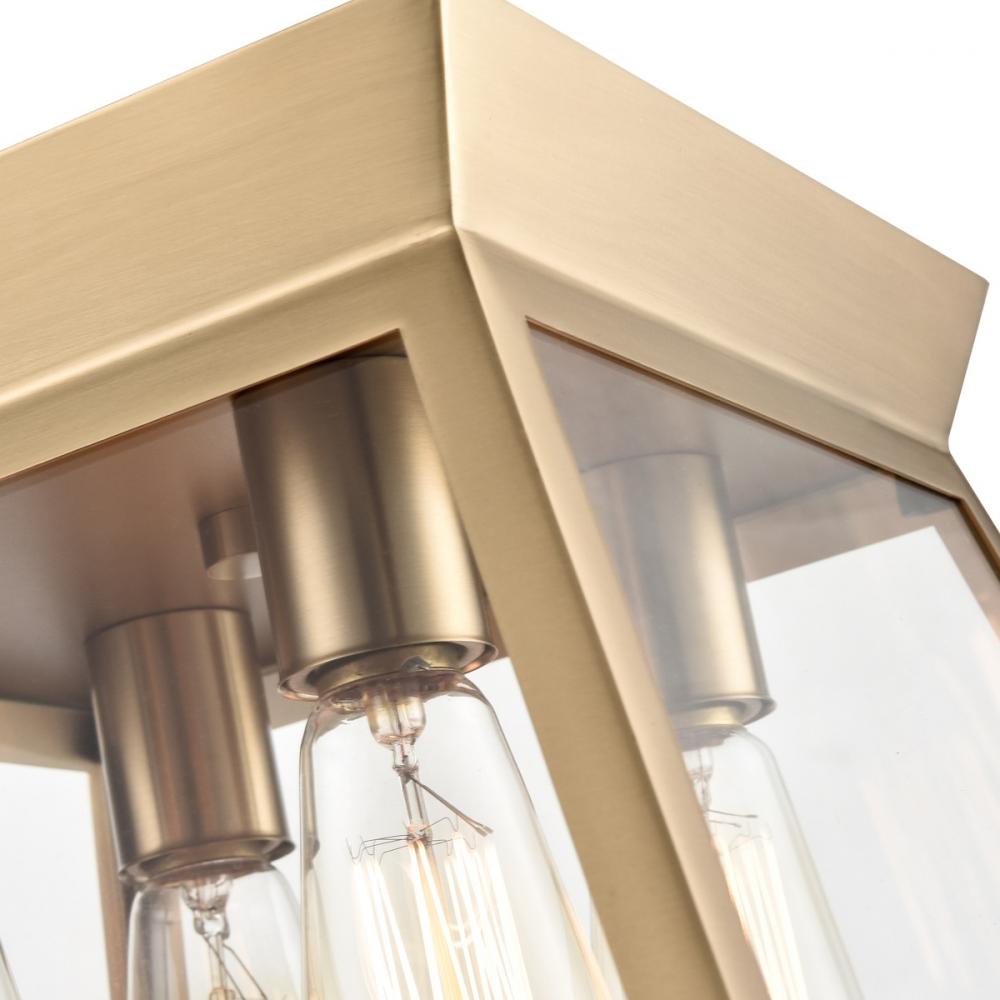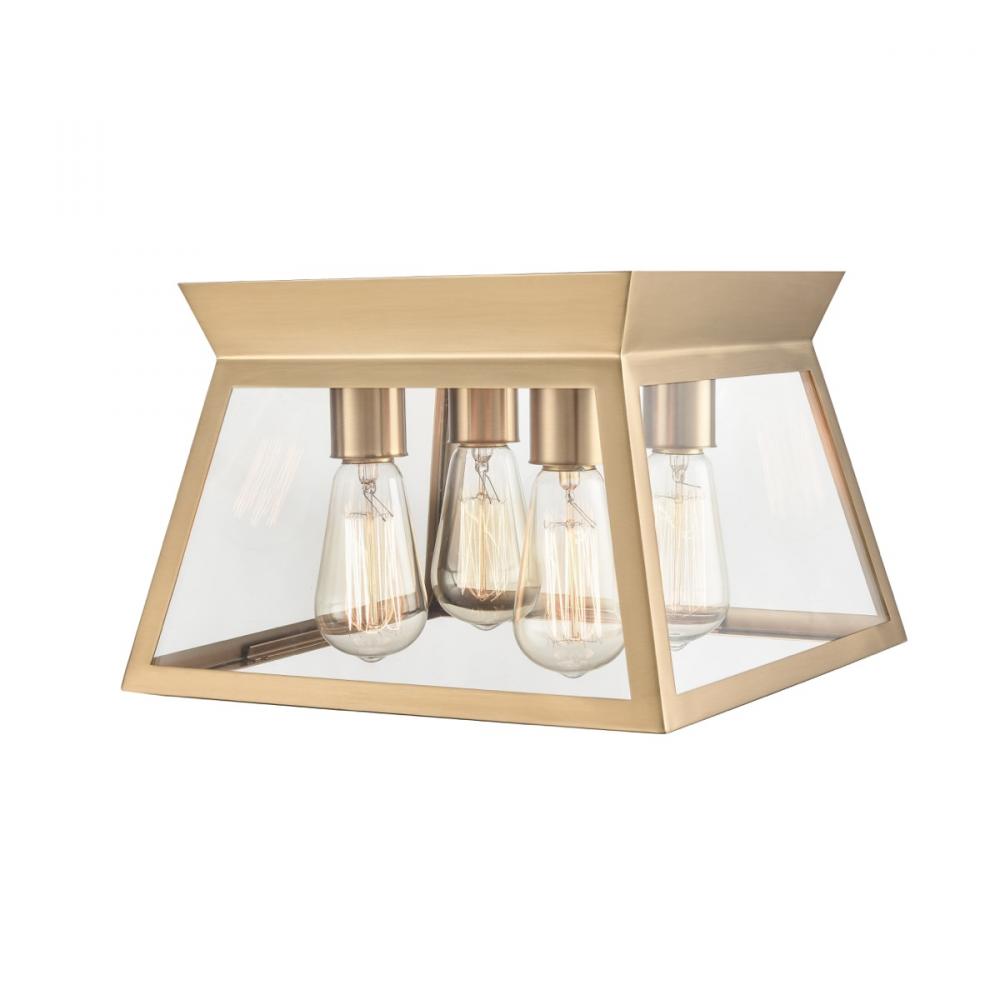 The Lucian collection, designed by Kevin Kraemer, is a modern twist on a classical lantern style light. Shown in a rich plated brushed brass (also available in black with brass accents). Clear panel glassware surrounding the bulbs. The model shown is a 4 light flushmount. Great for any area of the home.