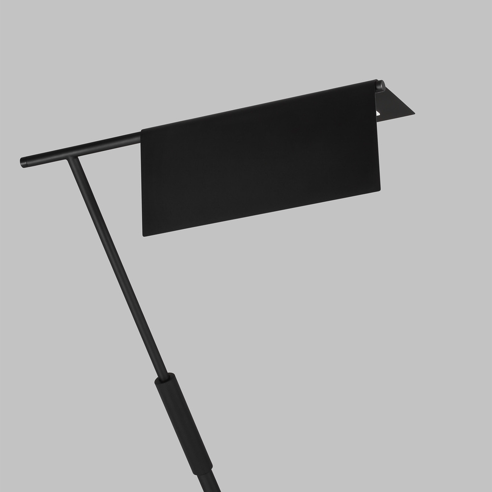 The Foles one light table lamp in midnight black by Chapman & Myers is a modernized version of a classic tent shade pharmacy lamp. The shade on each Foles Pharmacy light is formed from a sheet of metal which has been bent to drape over the frame in a traditional tent profile. The shade is supported by a simple metal tube framework and is counterbalanced with a distinctive cylindrical metal foot.