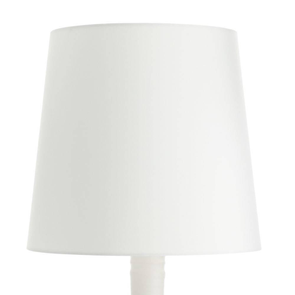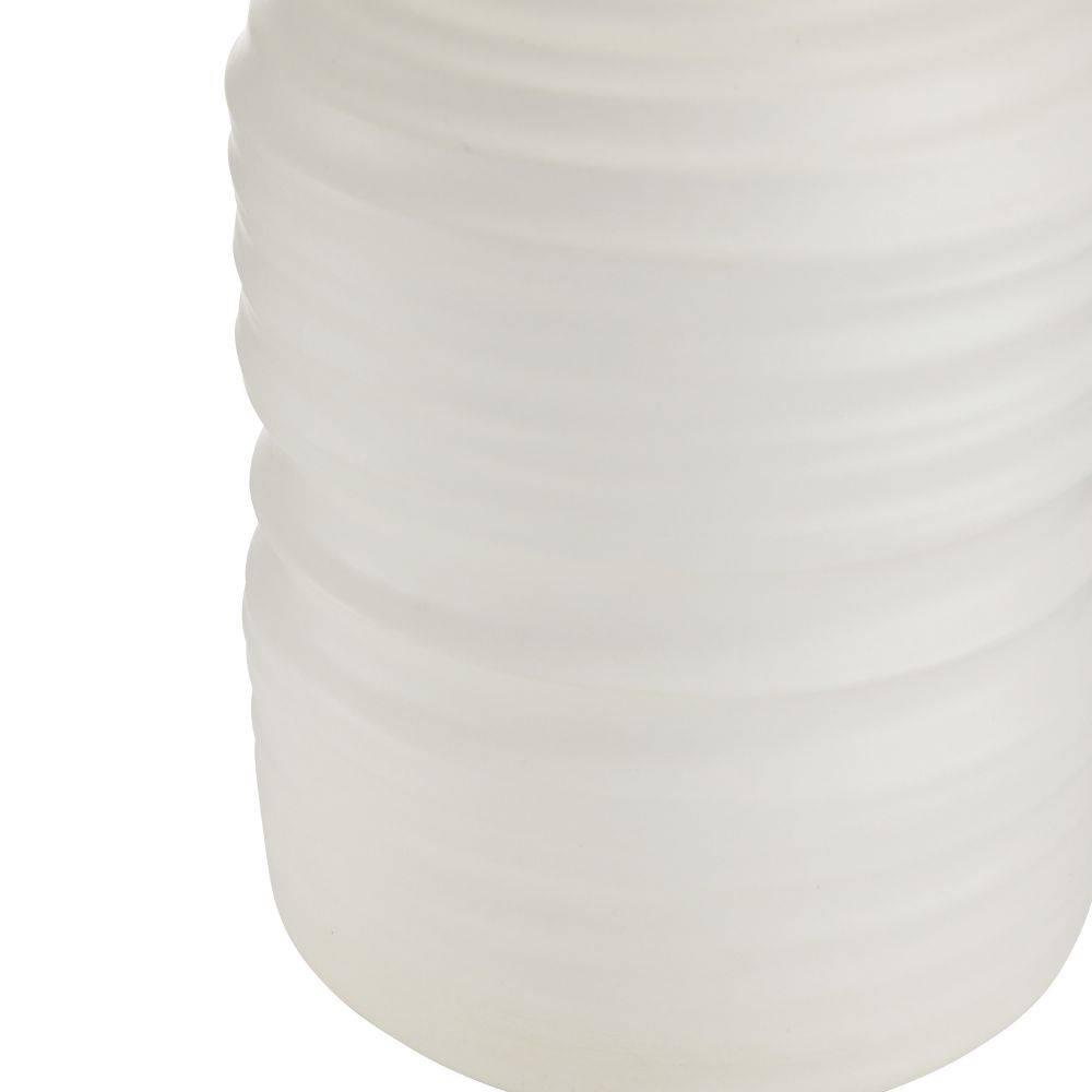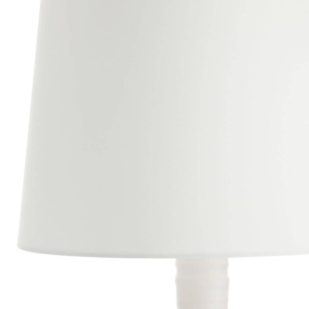 Ridged and grooved throughout its towering form, our white porcelain lamp has the resonant form of hand-thrown pottery. A tall drum shade in off-white microfiber lined in off-white cotton punctuates the rhythmic movement of its sculptural silhouette. Antique brass-plated steel hardware and finial.