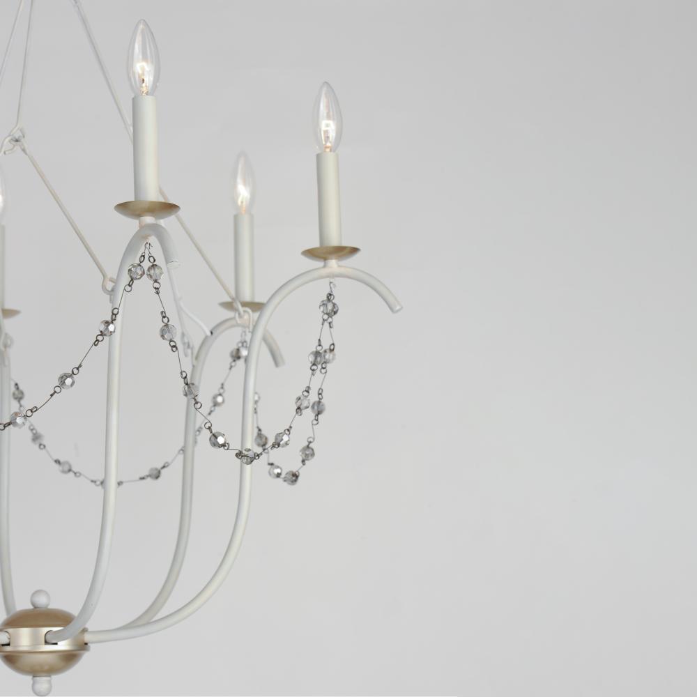 This series draws inspiration from regal agrarian manors, delivering a statement in its scale and sophisticated finishes. Designed in operatic proportions, the bottom chandelier assembly features swollen curves hand painted in a choice of Ecru White or Gol