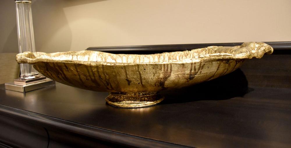 A 31" x 10" Forshey Bowl in gold leaf with an umber glaze offers a traditional waterfall feel. Perfect for displaying orbs or as a sculptural piece, it suits contemporary or transitional rooms with its beloved shape.