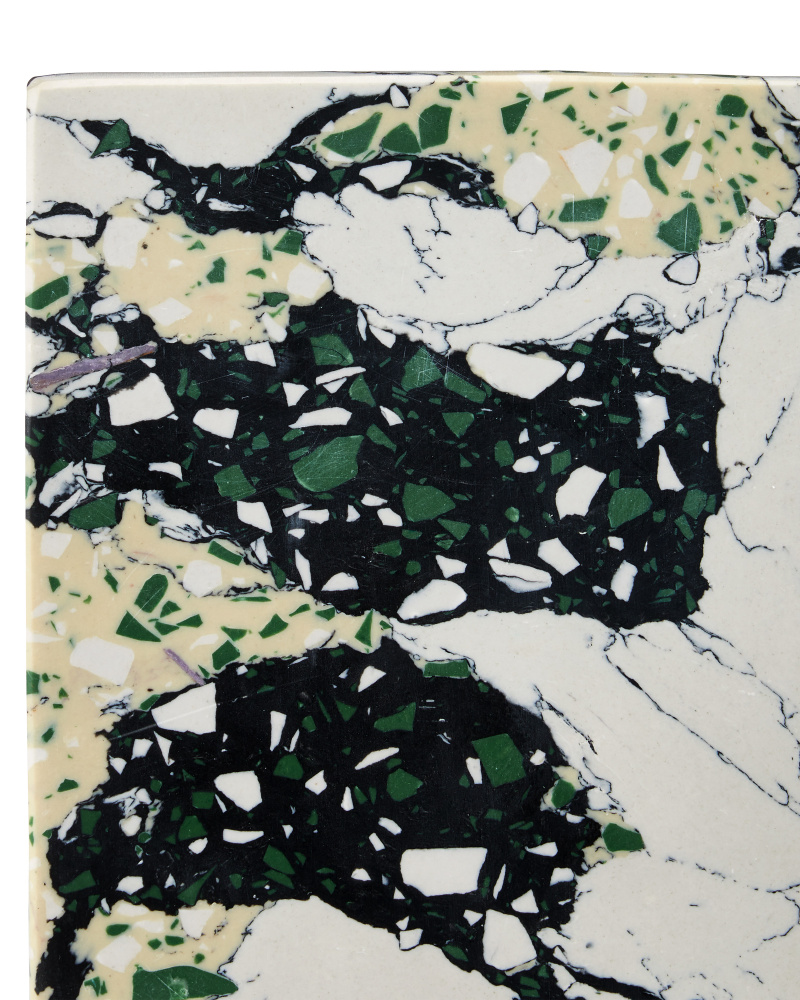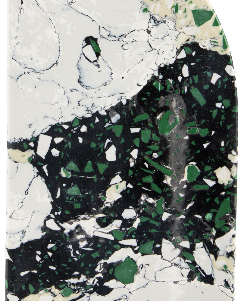 The Fossey Object Set is a pair of sculptures that look like they are made of natural granite, but are actually made of synthetic stone. The black and white decorative accessories with hints of green and pale yellow have swirling personalities that make them textural accents. The one curved edge brings them interesting profiles.