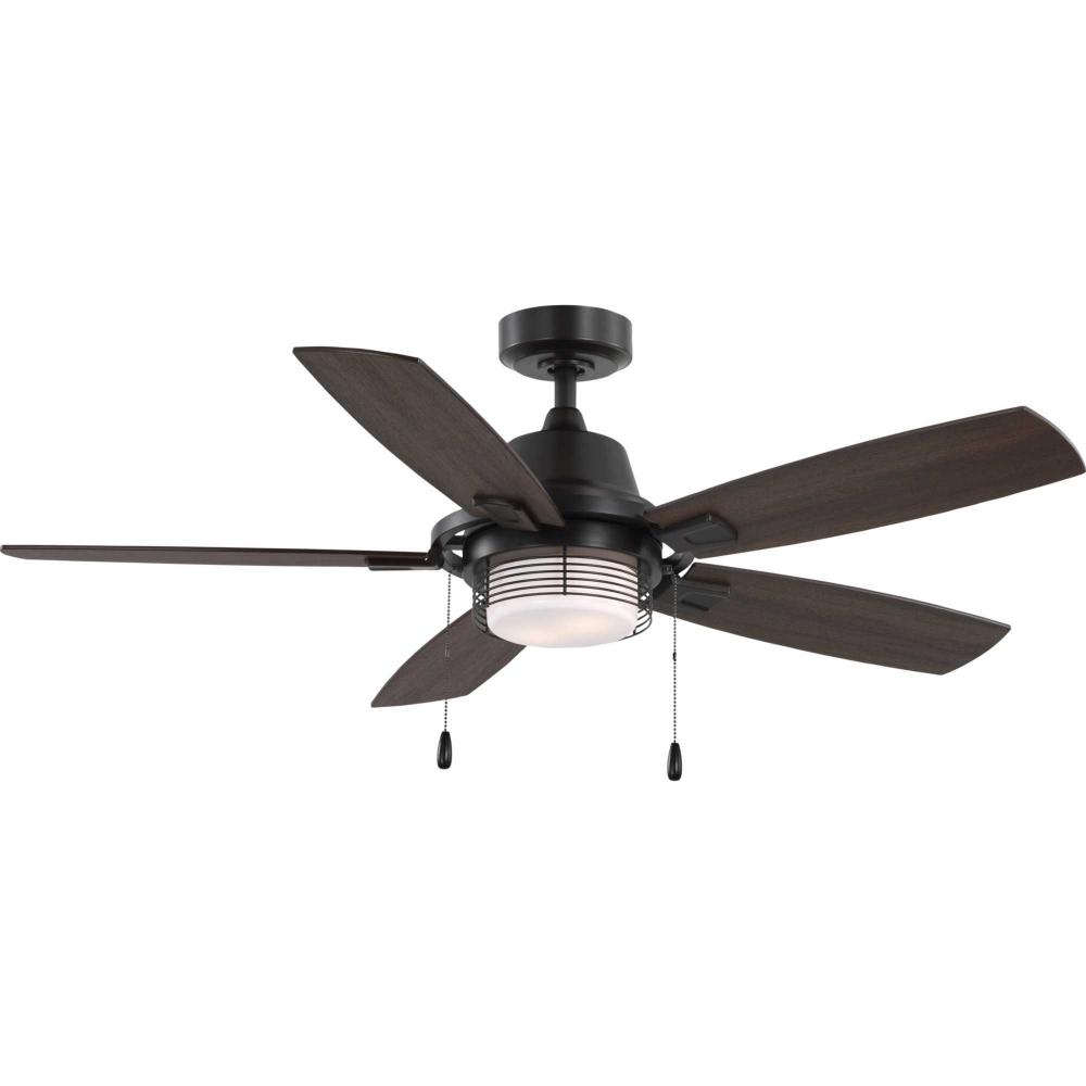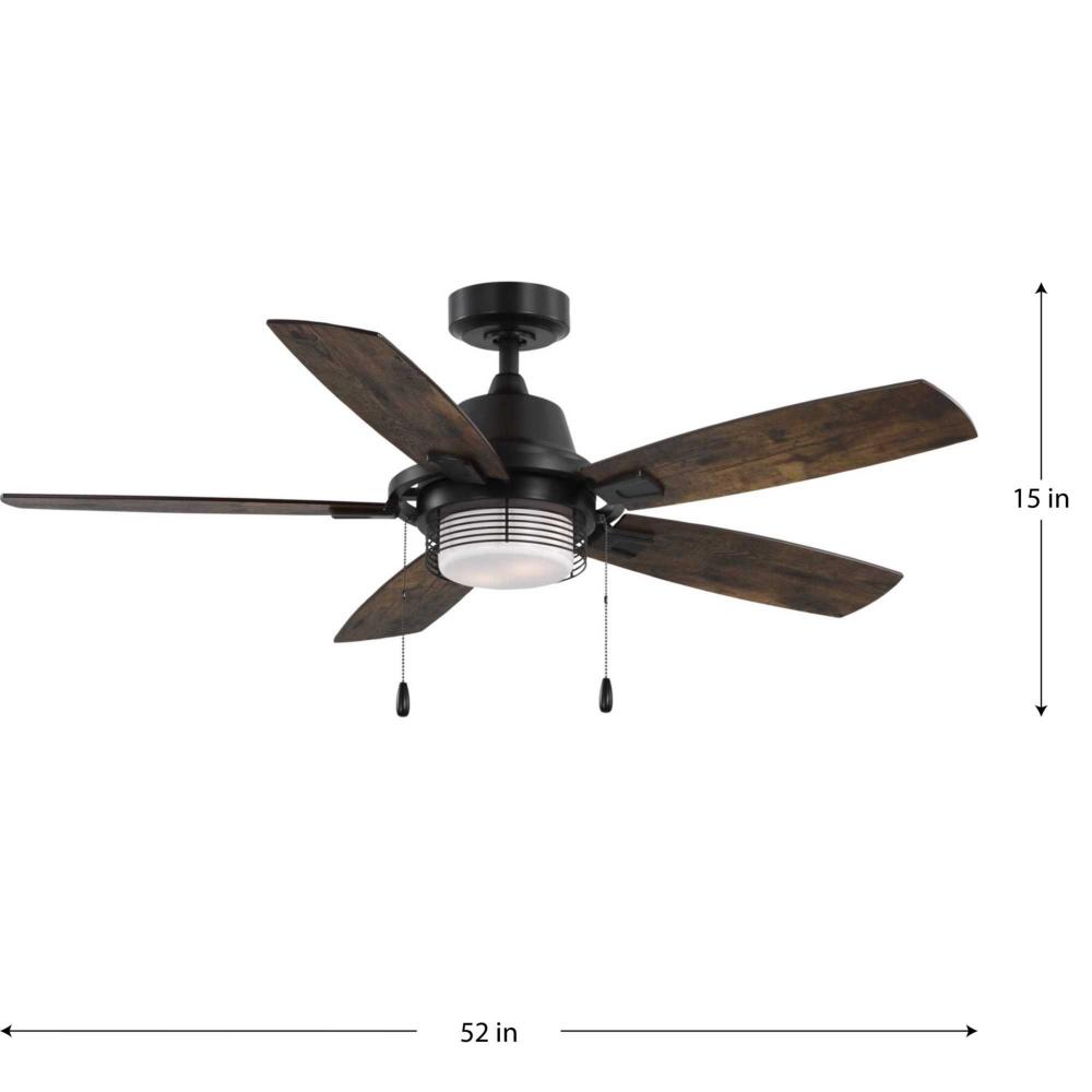 A wire-formed cage adds a touch of casual style to Freestone. Five reversible plywood blades finished in warm chestnut and mellow walnut offer a customizable option to complement the room's decor style. The light kit features a shatter-proof opal white shade for a soft glow and includes medium-based LED lamps for energy efficiency. Individual pull chains operate both the fan and the light.