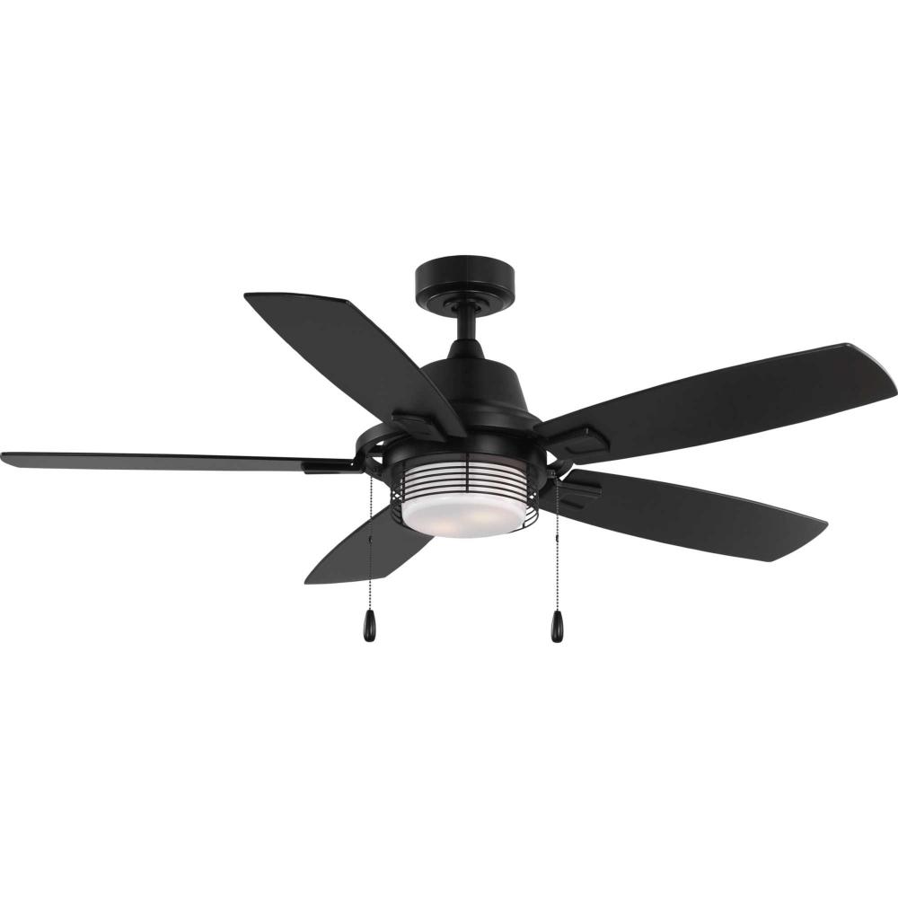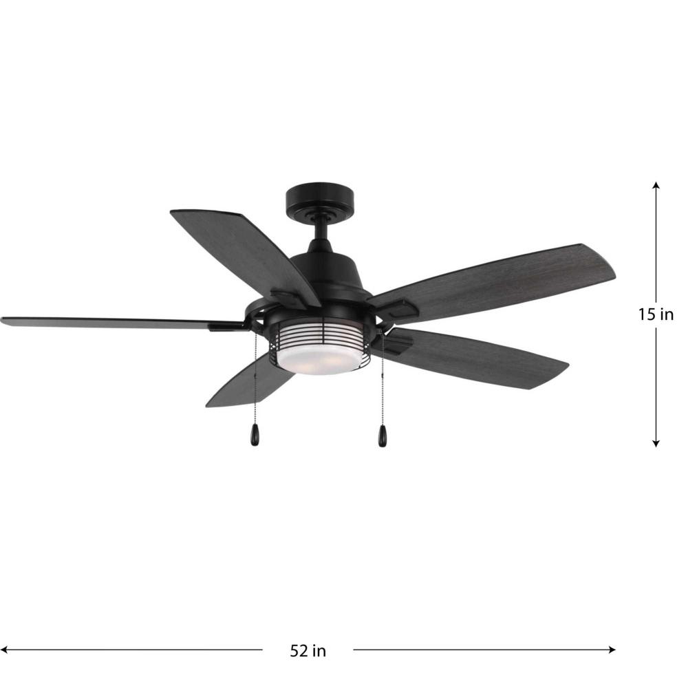 A wire-formed cage adds a touch of casual style to Freestone. Five reversible plywood blades finished in matte black and rustic charcoal offer a customizable option to complement the room's decor style. The light kit features a shatter-proof opal white shade for a soft glow and includes medium-based LED lamps for energy efficiency. Individual pull chains operate both the fan and the light.