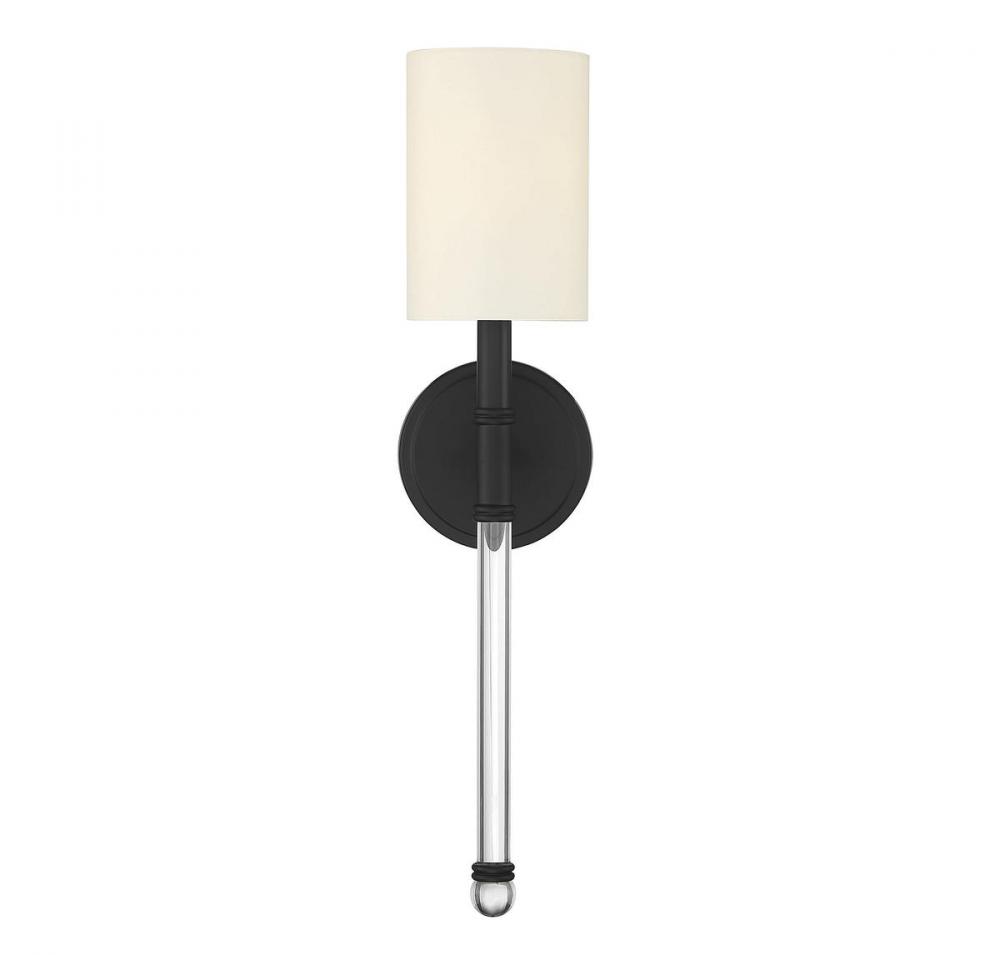 Slim and stylish! This Savoy House Fremont 1-light sconce packs a whole lot of textural interest into one slender silhouette. The round wall plate and light arm have double ring detailing and a matte black finish. The long tail of that arm is made of clear glass with a double ring above the glass ball finial. The cylindrical shade is a lovely soft white fabric. Altogether, it’s an elegant fixture that is a pleasure to have in your home. One 60W candelabra size bulb fits within the shade of this 5" wide and 21" high sconce. It’s the perfect size to place alone, in pairs or in groups along the walls of your dining room, kitchen, living room, entryway, bedroom, bathroom, office, family room, media room or hallway.