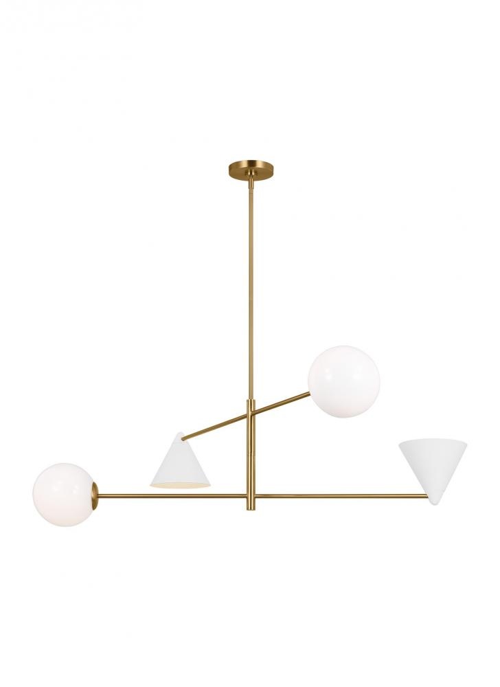 The Cosmo series by AERIN for Visual Comfort Studio Collection plays with asymmetry, combining milk glass globes that emit a soft glow, and metal cone shades, which focus light above and below.