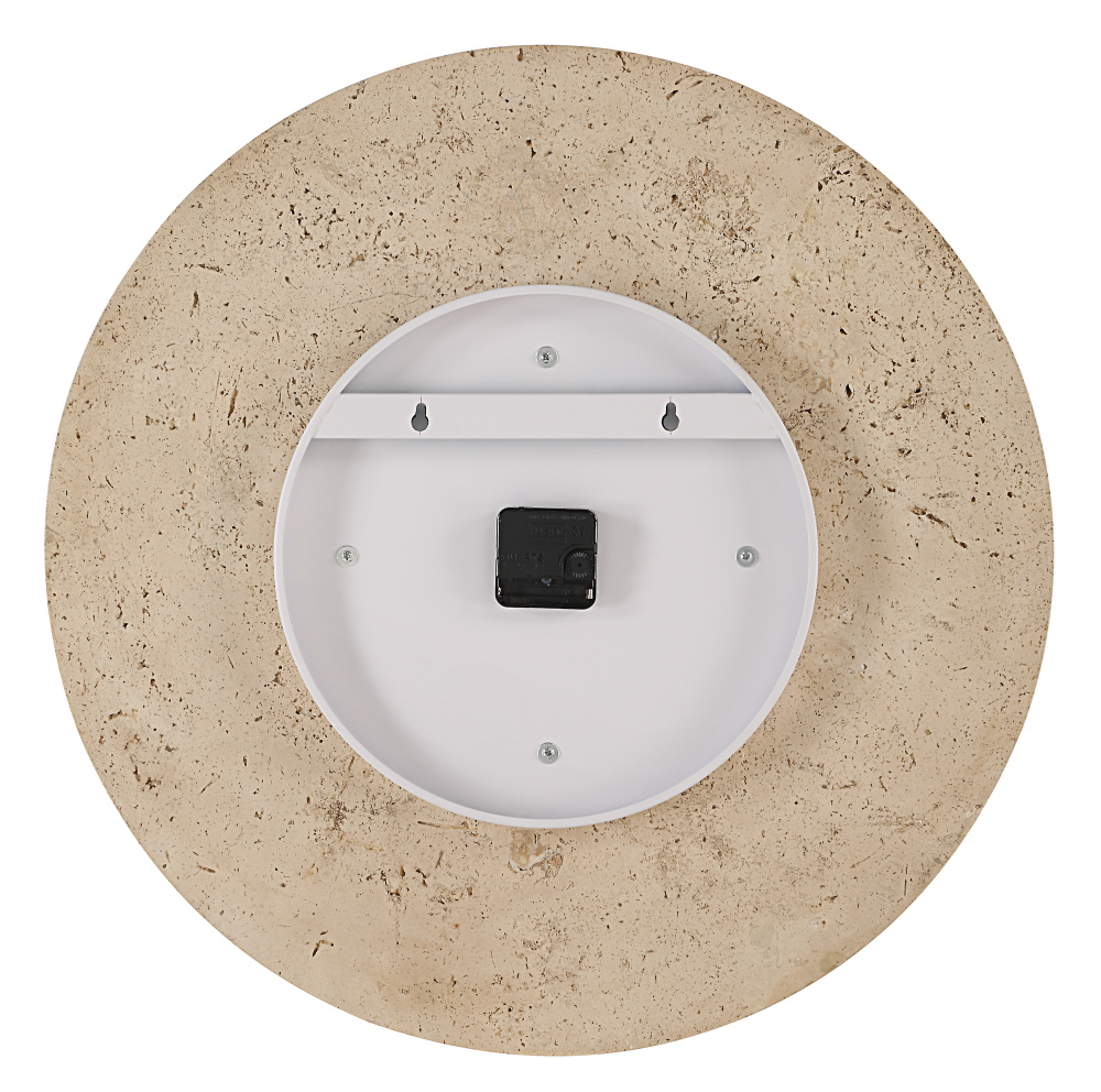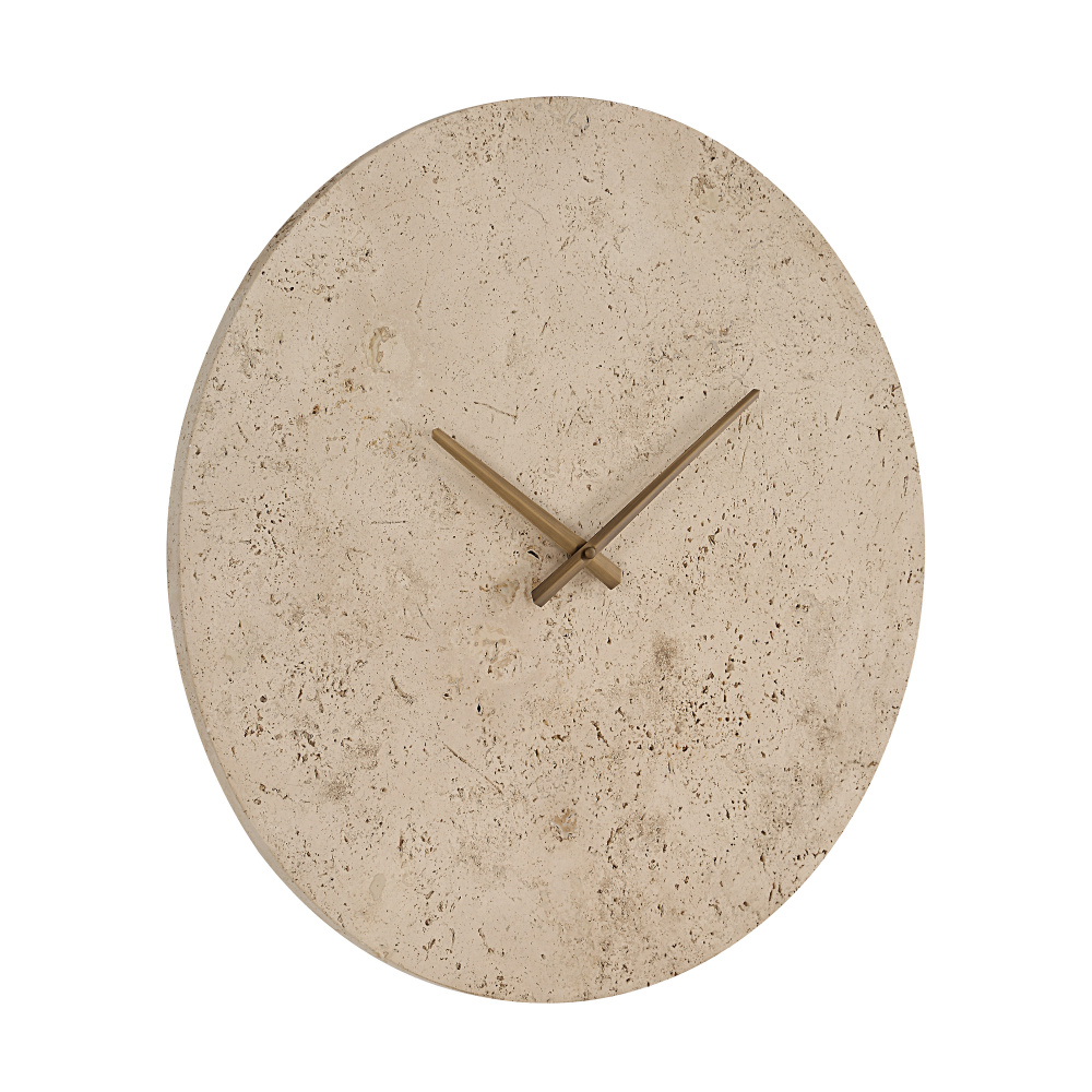 This wall clock uses travertine as a stylish choice for anyone wanting to inject enduring elegance into their space. Marrying fashion and function, its natural stone face, antique brushed brass-plated hands and number-free design are an example of time-telling perfection.