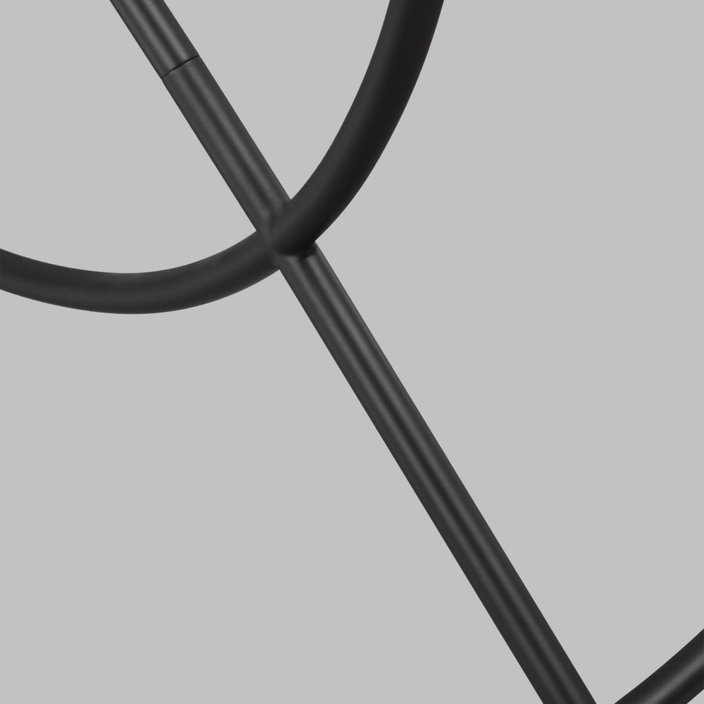 The Galassia four light single tier chandelier by AERIN in midnight black balances glass globes on an elongated frame, which gives it a contemporary look. The white glass casts a soft, welcoming glow, while the elongated frame works particularly well in large, high-ceiling rooms.