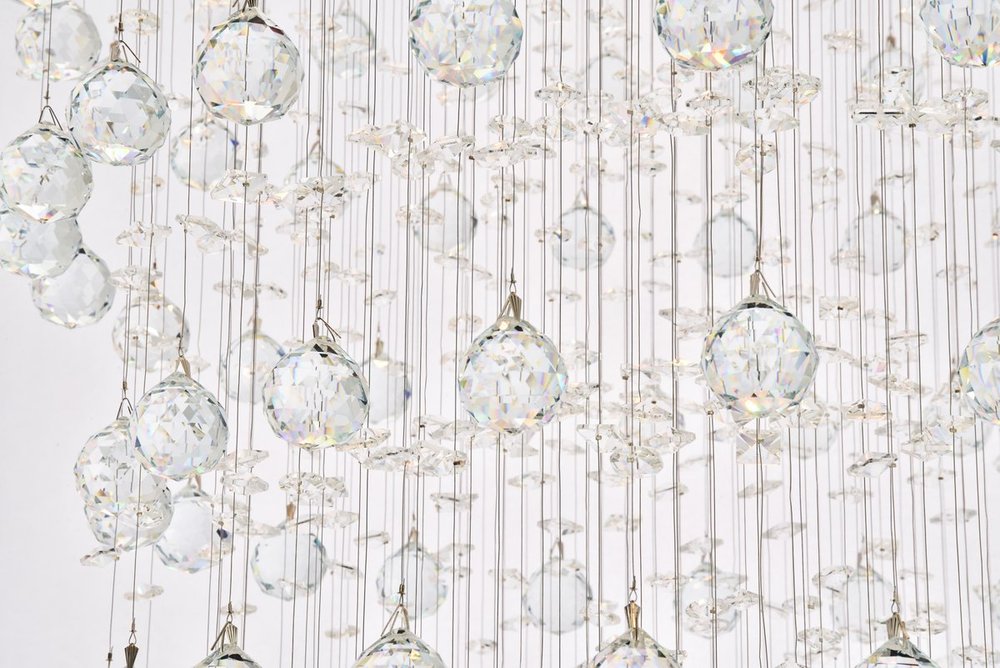 Diameter of 32 inches; minimum hanging height of 100 inches, maximum hanging height of 194 inches.