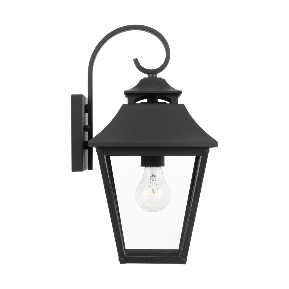 Designed by Sean Lavin, the Galena one light outdoor wall fixture in textured black enhances the beauty of your property makes your home safer and more secure, and increases the number of pleasurable hours you spend outdoors. Galena is a Europe-inspired classic lantern. Simple and refined, Galena features a gently curved hook detail atop a vented, square-off roofline and candle tubes floating within the tapered clear glass shades. Galena is a warm, welcoming silhouette offered in a Sable or Textured Black finish.
