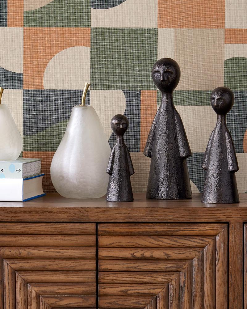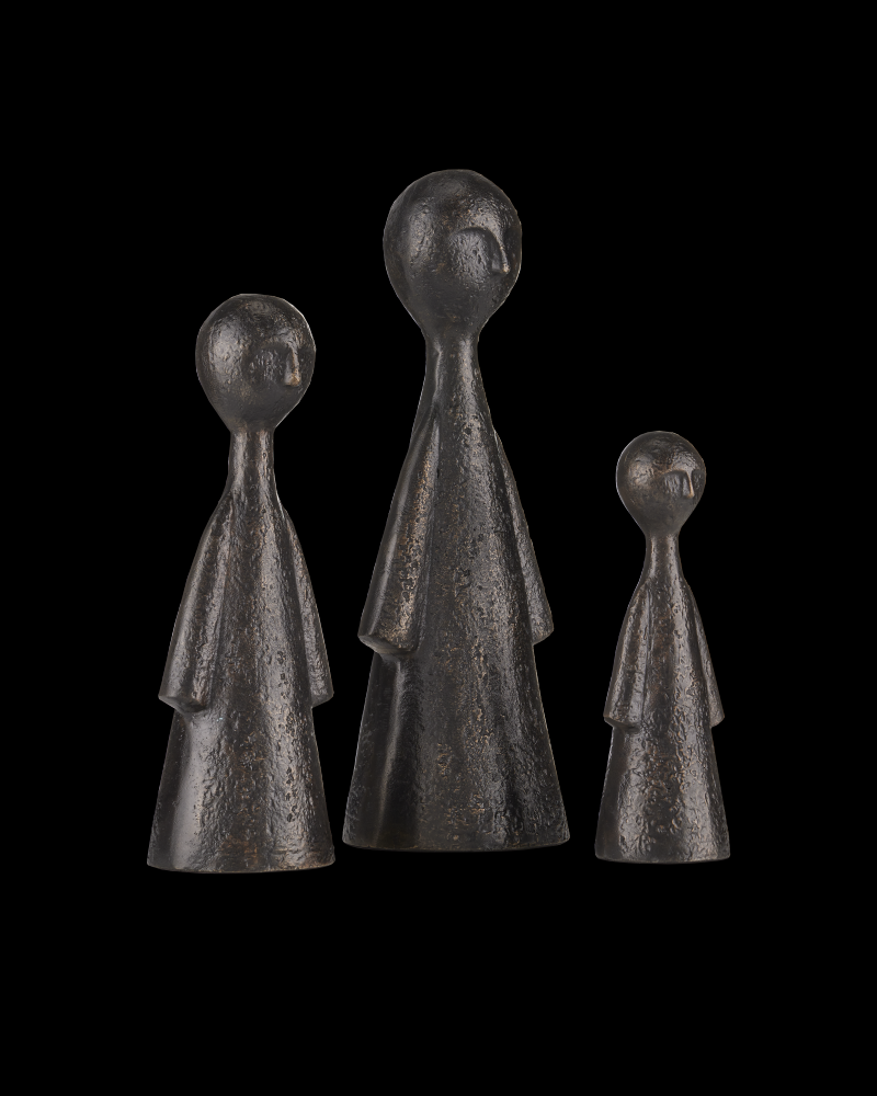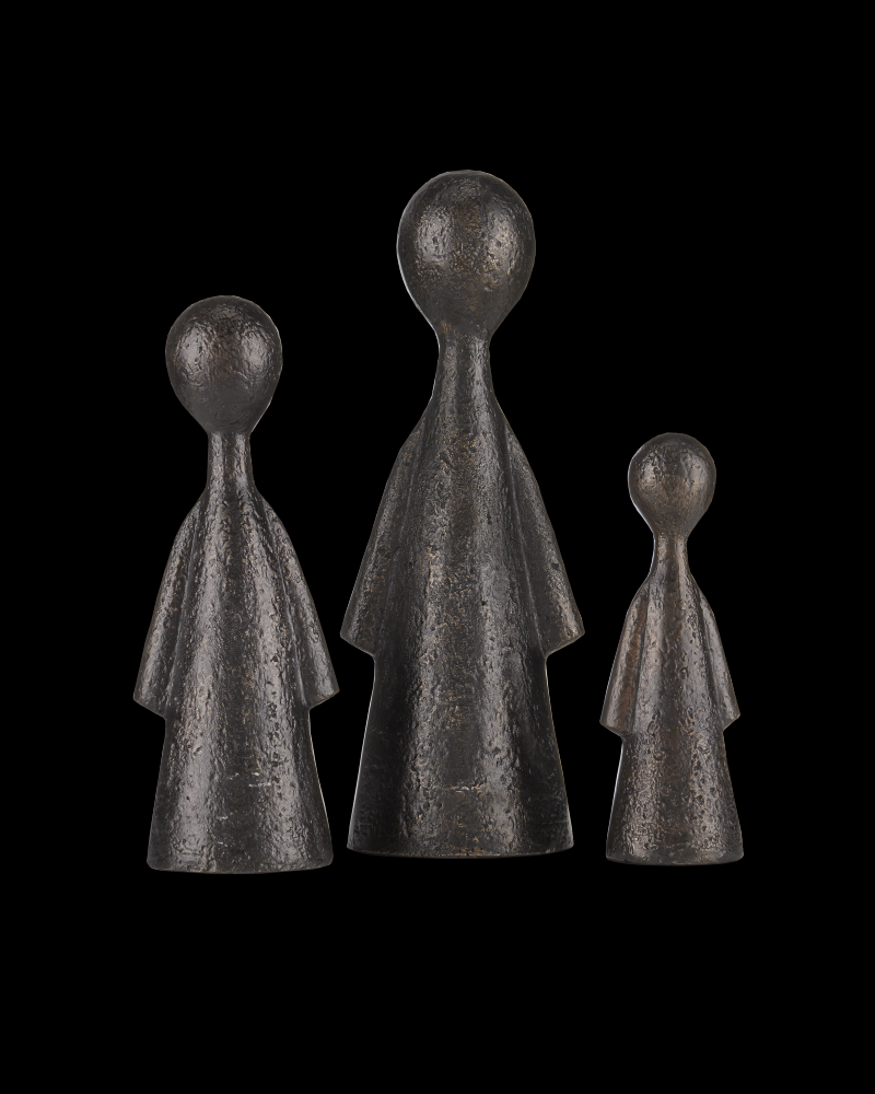 The Ganav Bronze Figure Set includes three angelic figures made of cast aluminum. Inspired by a beloved toy, this family of bronzed sculptures with heavily pitted surfaces illustrates a hallmark of finely wrought metal poured into molds in a foundry. The simplicity of the profiles, including the facial details, makes these tabletop sculptures excellent accents for a variety of interior styles.