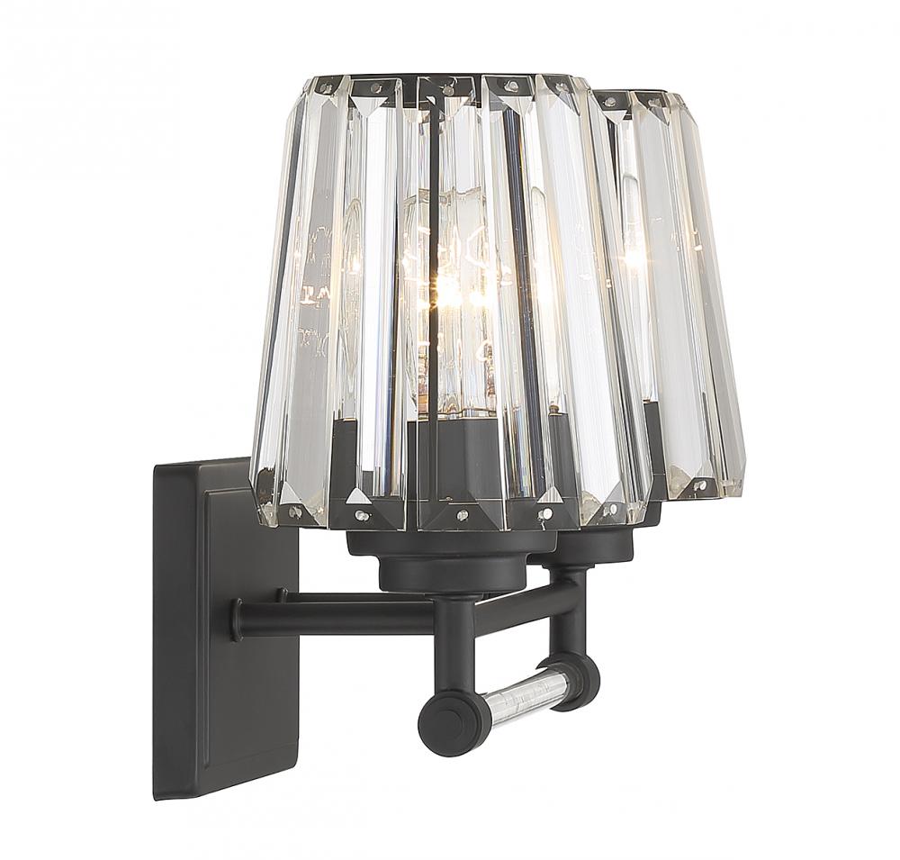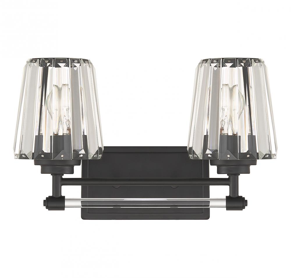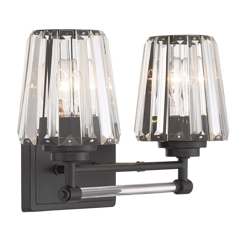 Take the glam factor of your bathroom up a notch with the Savoy House Garnet 2-light bath vanity light! Slats of faceted clear crystal add shimmer while the crystal tube detailing on the arms brings even more shine. Finished in matte black. Garnet is 9.5" in height, 16" in width and extends 7" from the wall. Uses 2 standard size bulbs of up to 60 watts per bulb (bulbs not included).