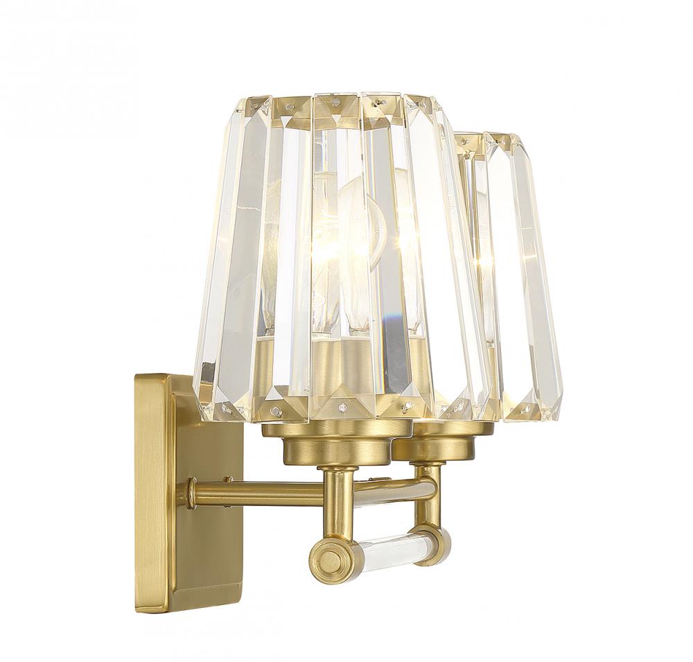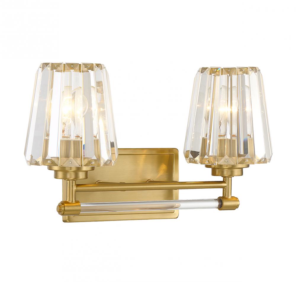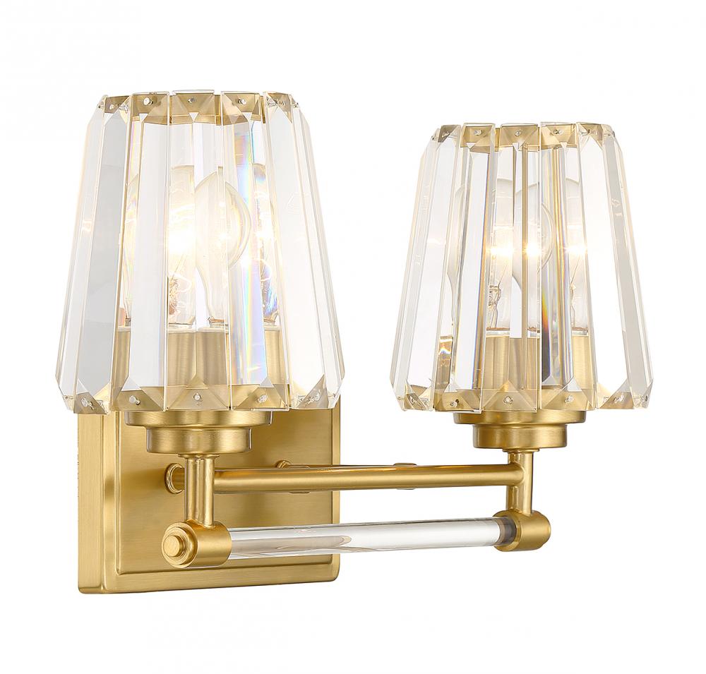 Take the glam factor of your bathroom up a notch with the Savoy House Garnet 2-light bath vanity light! Slats of faceted clear crystal add shimmer while the crystal tube detailing on the arms brings even more shine. Finished in warm brass. Garnet is 9.5" in height, 16" in width and extends 7" from the wall. Uses 2 standard size bulbs of up to 60 watts per bulb (bulbs not included).