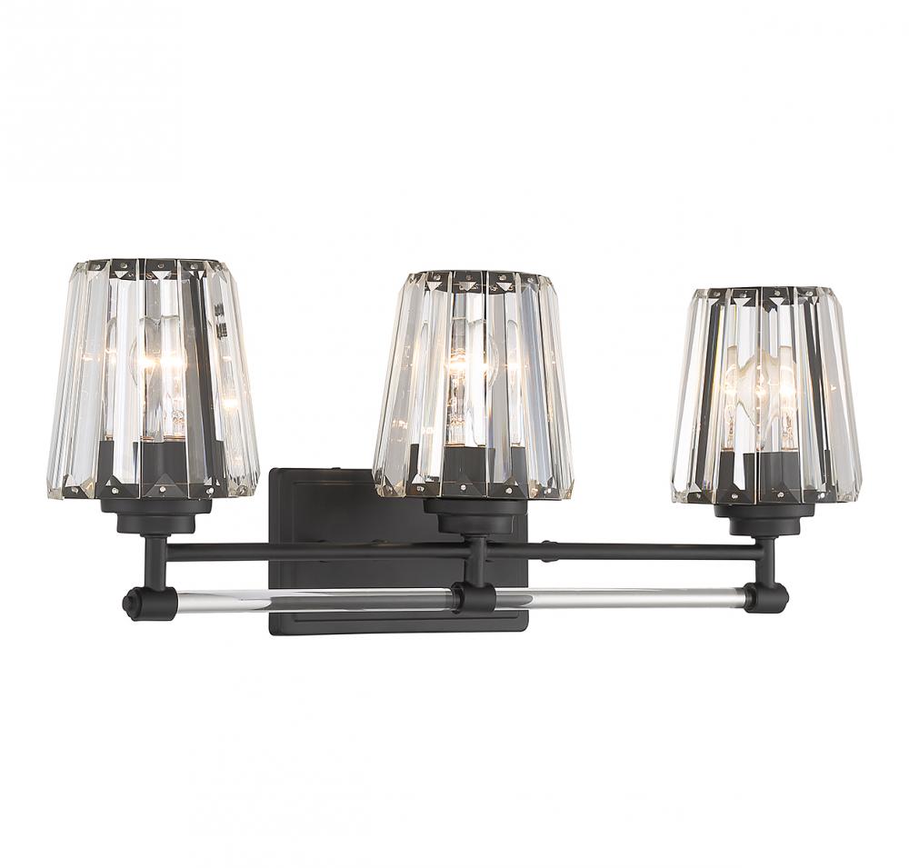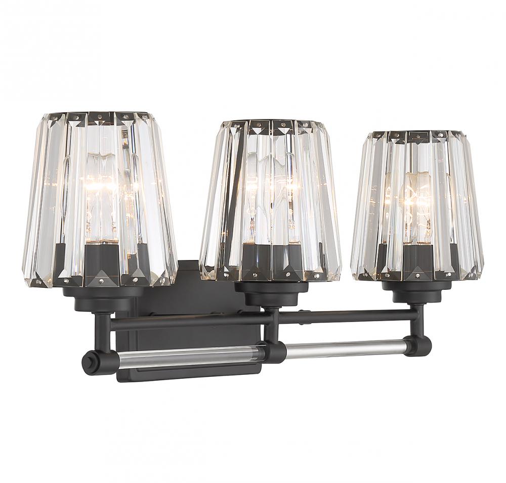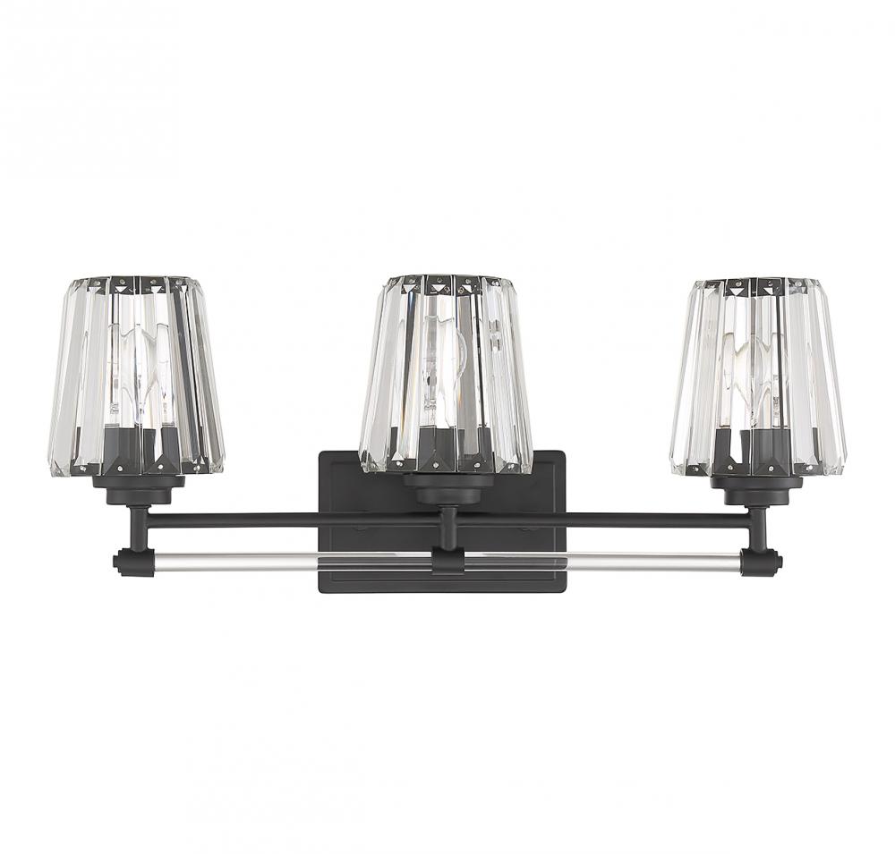 Take the glam factor of your bathroom up a notch with the Savoy House Garnet 3-light bath vanity light! Slats of faceted clear crystal add shimmer while the crystal tube detailing on the arms brings even more shine. Finished in matte black. Garnet is 9.5" in height, 24" in width and extends 7" from the wall. Uses 3 standard size bulbs of up to 60 watts per bulb (bulbs not included).