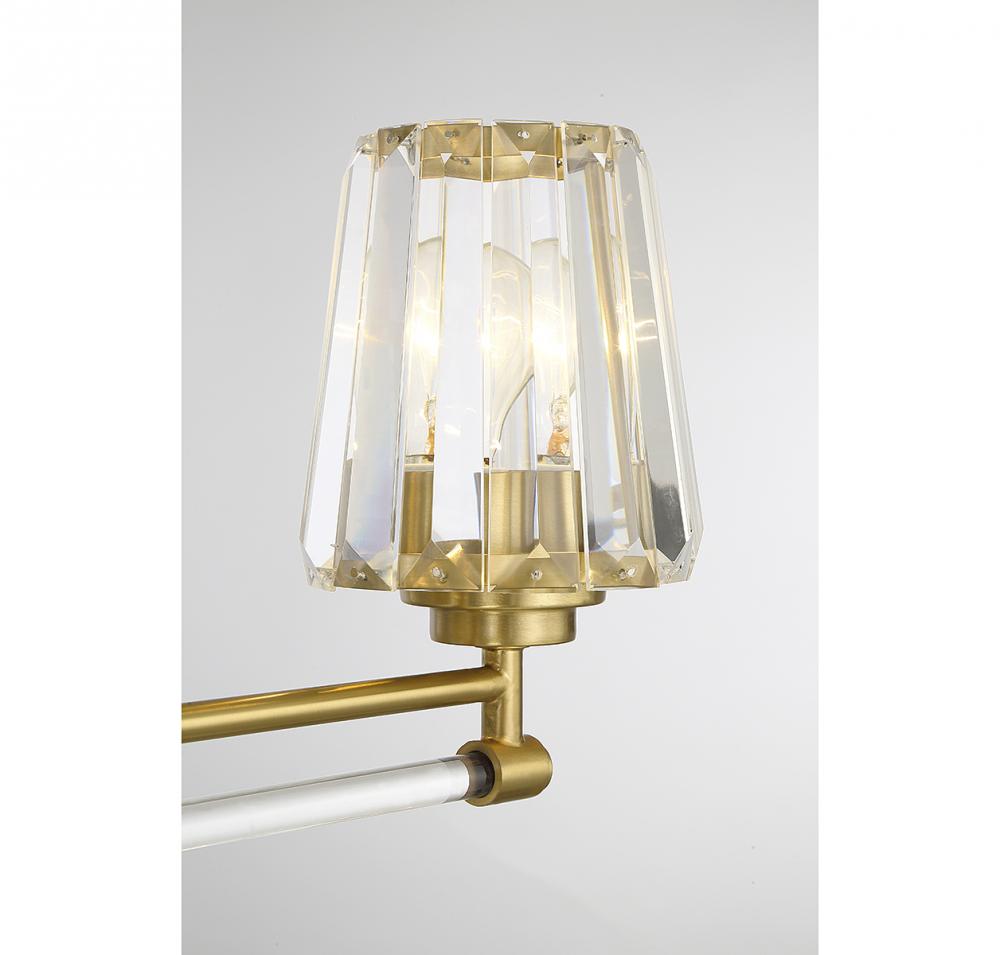 Take the glam factor of your bathroom up a notch with the Savoy House Garnet 3-light bath vanity light! Slats of faceted clear crystal add shimmer while the crystal tube detailing on the arms brings even more shine. Finished in warm brass. Garnet is 9.5" in height, 24" in width and extends 7" from the wall. Uses 3 standard size bulbs of up to 60 watts per bulb (bulbs not included).