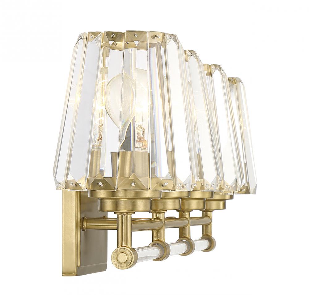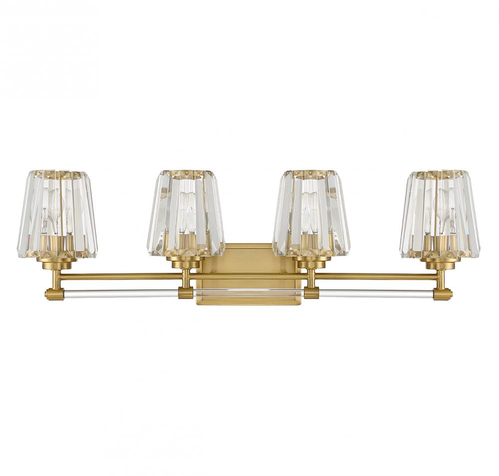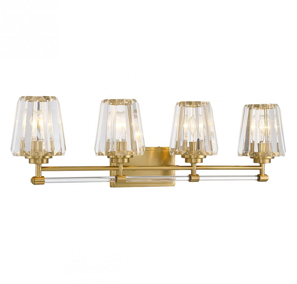 Take the glam factor of your bathroom up a notch with the Savoy House Garnet 4-light bath vanity light! Slats of faceted clear crystal add shimmer while the crystal tube detailing on the arms brings even more shine. Finished in warm brass. Garnet is 9.5" in height, 32" in width and extends 7" from the wall. Uses 4 standard size bulbs of up to 60 watts per bulb (bulbs not included).