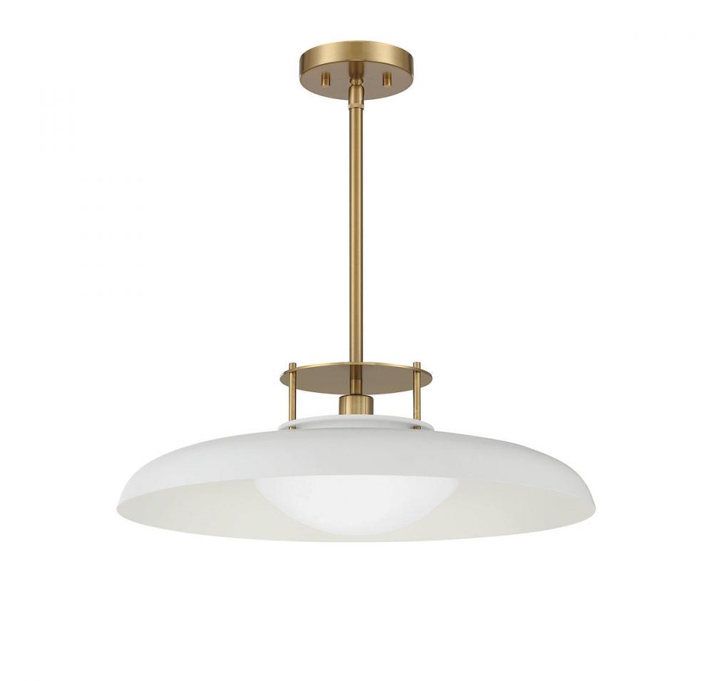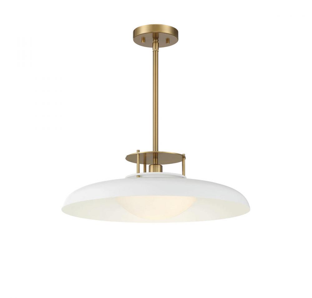 This Savoy House Gavin 1-light pendant brilliantly combines vintage and midcentury modern style touches to create a thoroughly modern take on illumination. Gavin uses an opal glass shade and a wide metal shade to soften and direct the light. Finished in white with warm brass accents. Gavin is 20" in width and has an adjustable height ranging from 14" to 60". It uses one standard size bulb of up to 60 watts. Comes with four 12" downrods and one 6" downrod, plus 80" of cord.