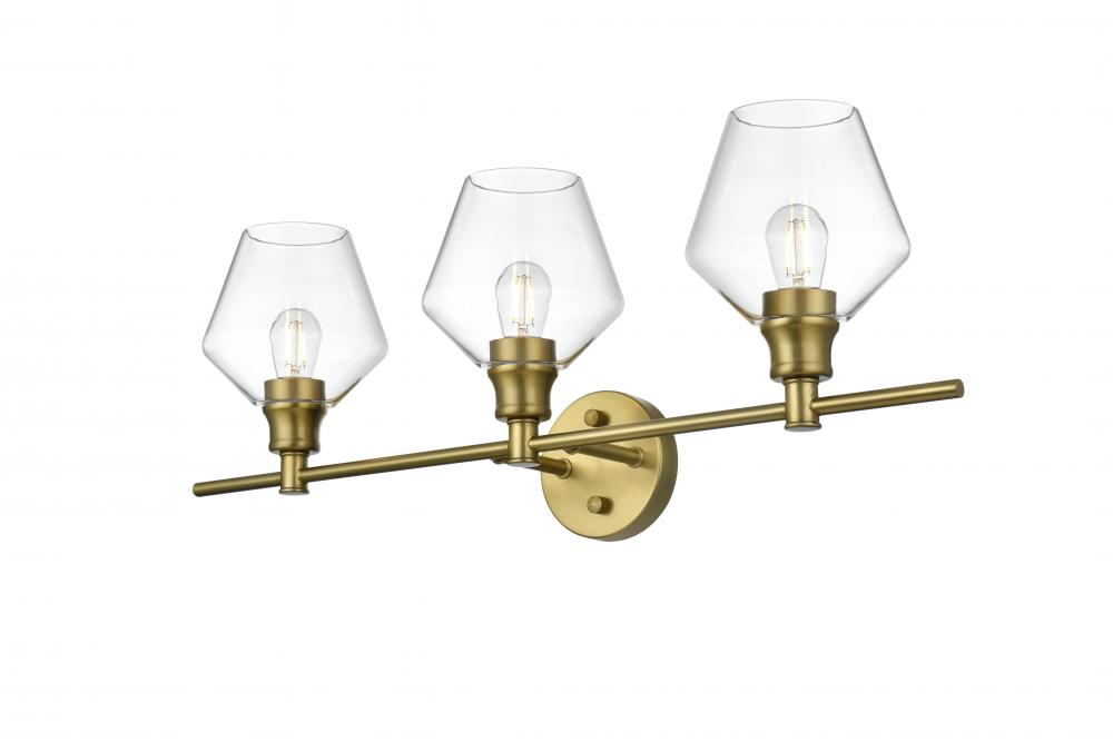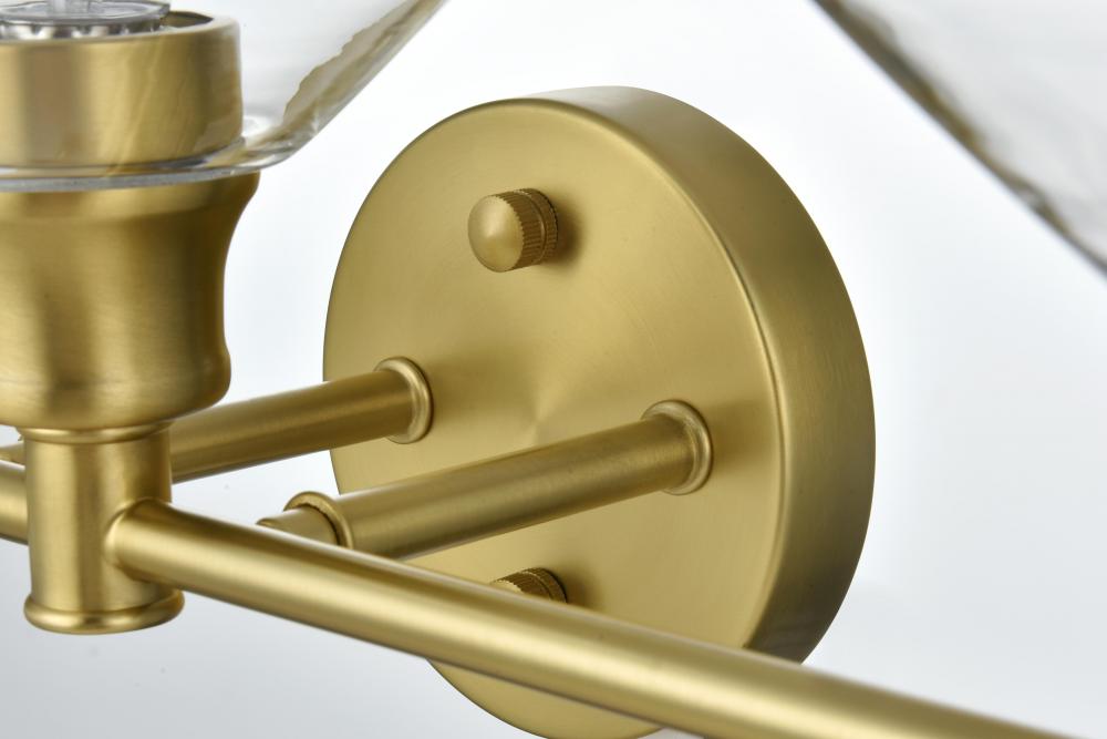 Enhance your living space with this versatile and modern wall sconce. Available in satin gold, chrome, black, and brass finishes, this fixture brings a touch of luxury to any room. The wall sconce features a pair of uniquely shaped, flared clear glass shades that deliver a beautiful, ambient glow, whether mounted upwards or downwards. Crafted from durable iron and glass, it combines strength with style, and the clean lines of the round backplate and horizontal arm create a contemporary aesthetic. Designed for hardwired installation, this fixture uses E26 standard sockets, allowing you to choose the ideal bulbs for your setting. This wall sconce is the perfect blend of form and function, ready to add a stylish and inviting touch to your home.