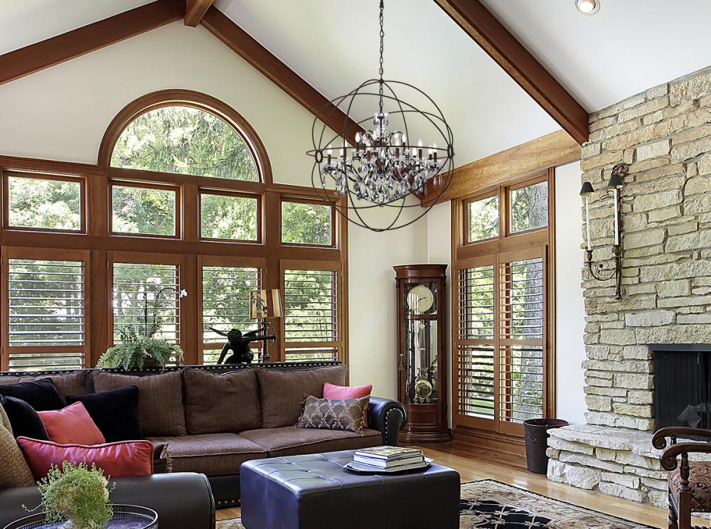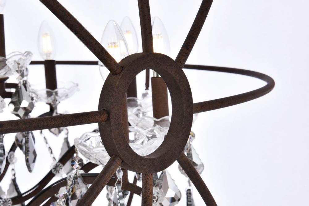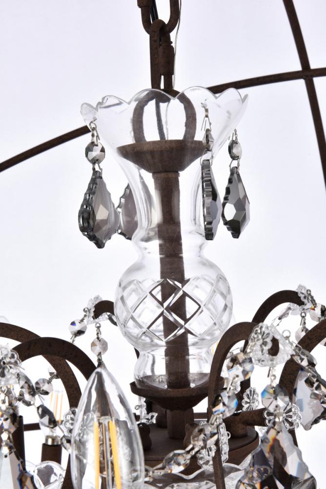 Royal-cut silver-shade crystals and 18 candelabras create a dramatic contrast with the rustic-intent finish