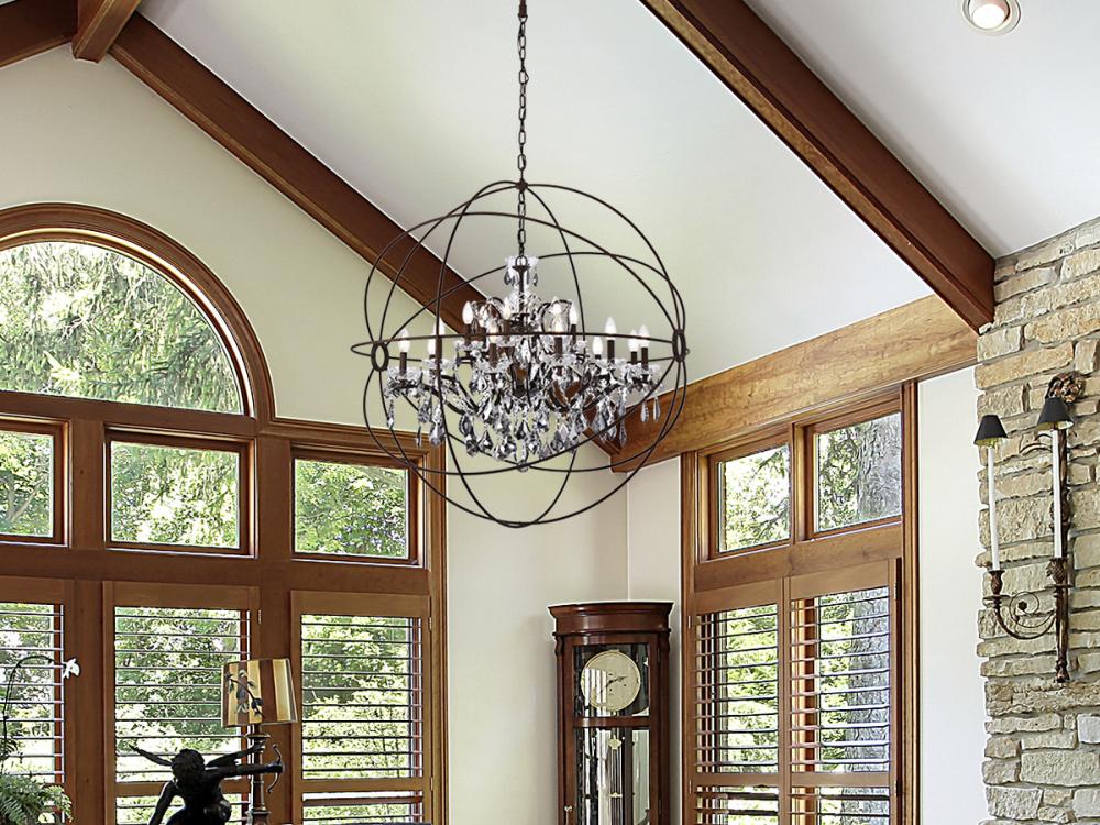 Make a statement or set the mood in your living room, dining room, or foyer with the transitional style of a Geneva chandelier. The Geneva collection is an eye-catching design that starts with the Old World feel of a classic crystal chandelier and then suspends it in a lamp body that takes on the New Age look of a gyroscope. Graceful candelabras are embellished with several sizes and layers of royal-cut crystals in clear, golden teak, or Silver shade that transform into a luminous globe when framed in a sphere finished in dark bronze, polished nickel, or rustic intent.